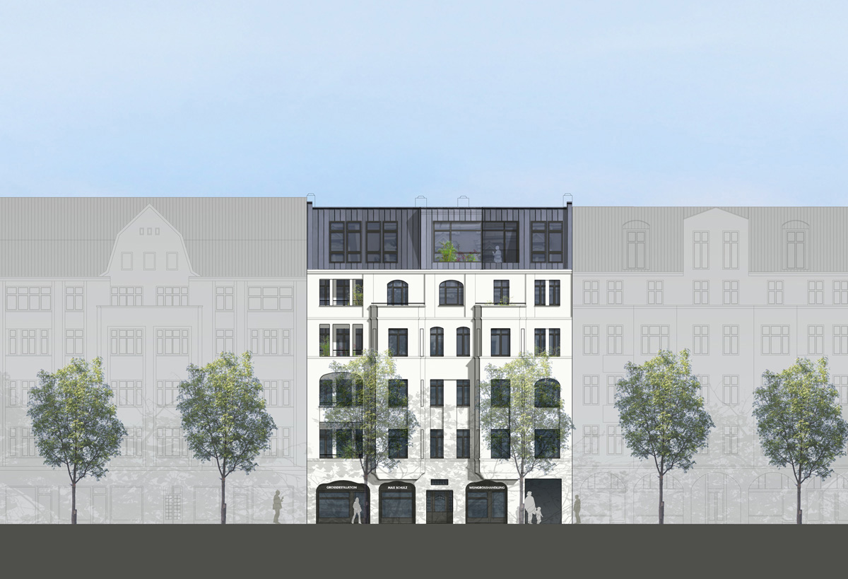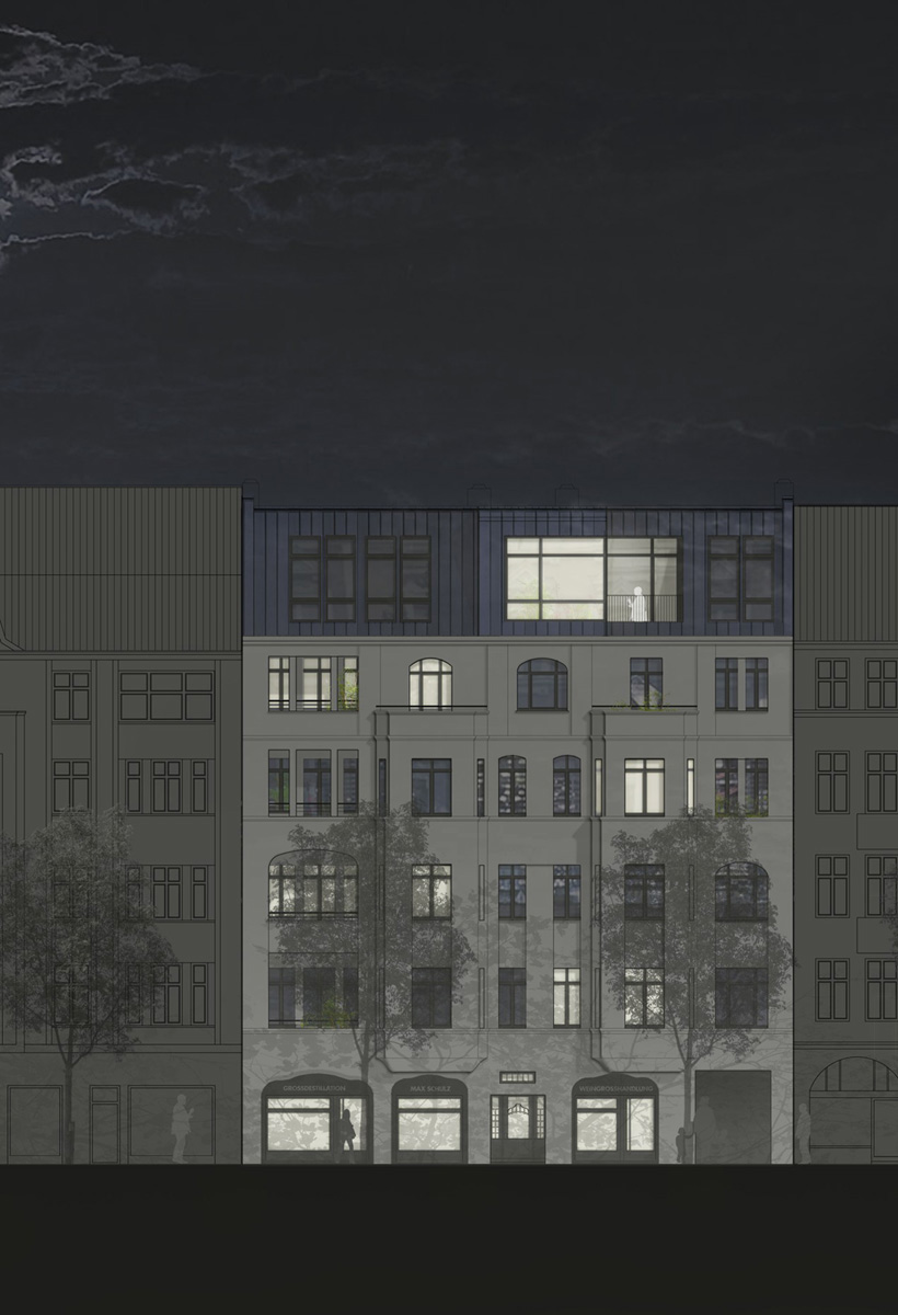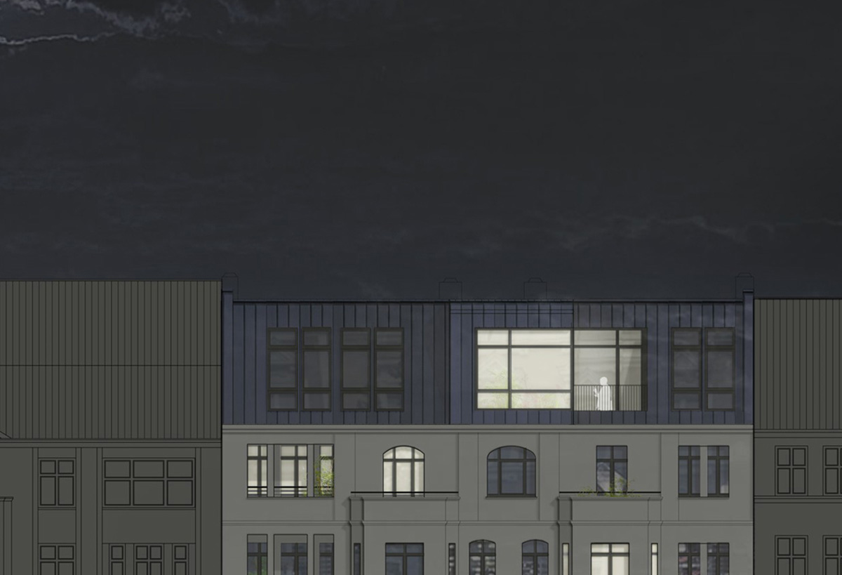 Es greift die geneigte Form des Berliner Daches auf und platziert mittig eine Box, die die Form eines klassischen Frontspieß interpretiert und mit großzügig verglasten Flächen wie eine große Laterne den Abschluss des Hauses markiert.