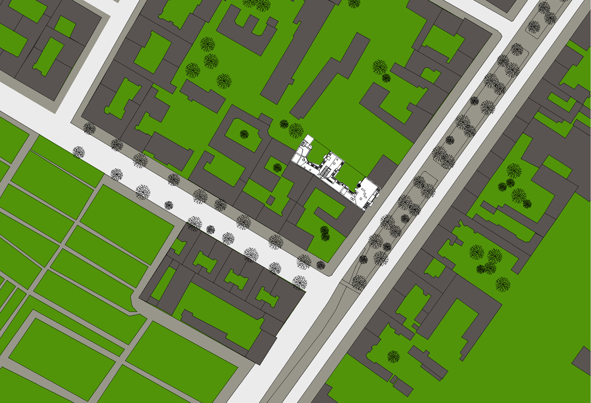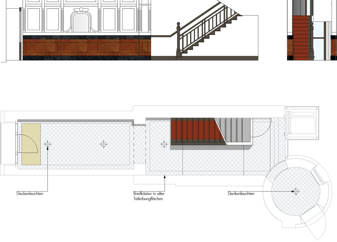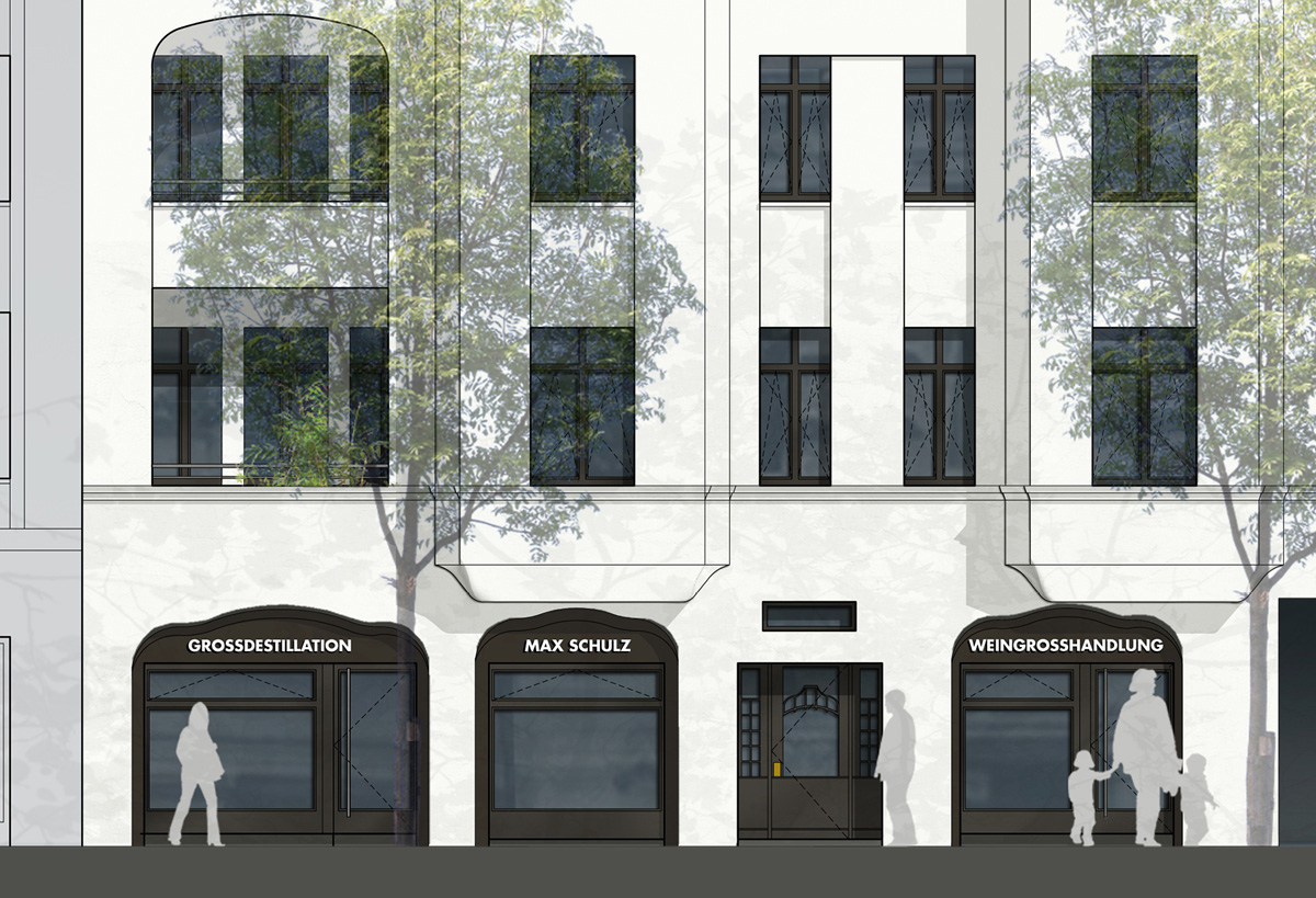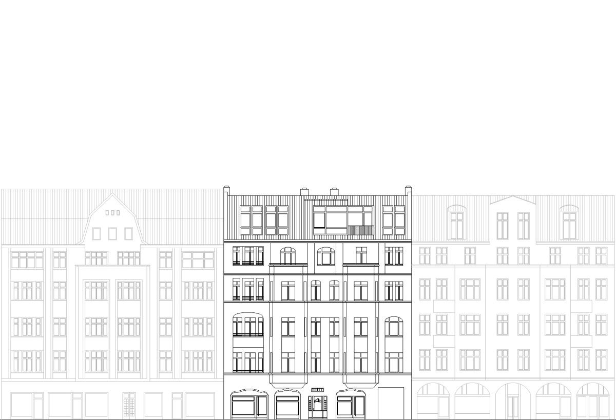 Unsere Planung für die Straßenfassade übernimmt Gliederungselemente der historischen Fassade, ohne eine Rekonstruktion des Bildes der detailreichen Fassadenplanung von 1902 zu suchen.