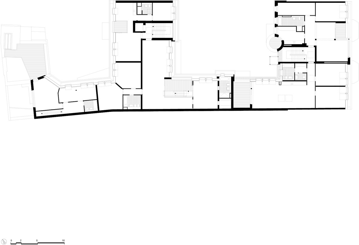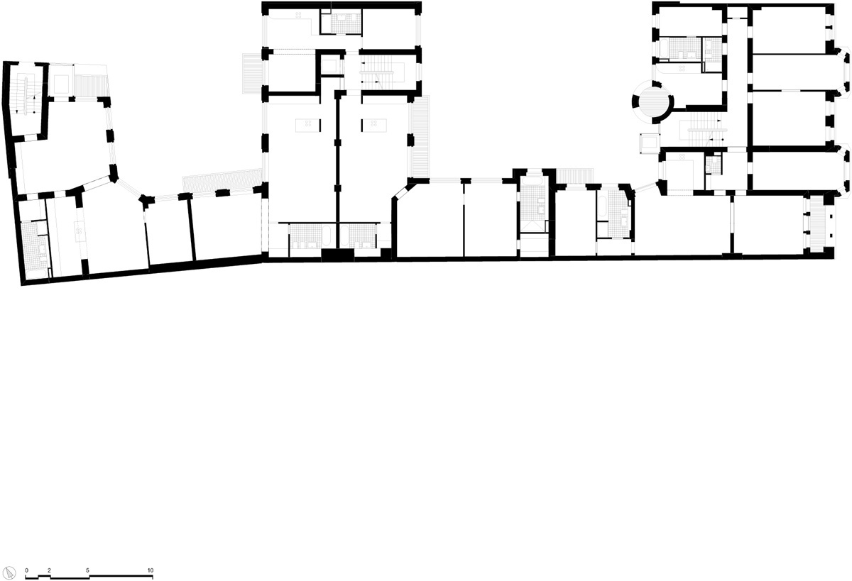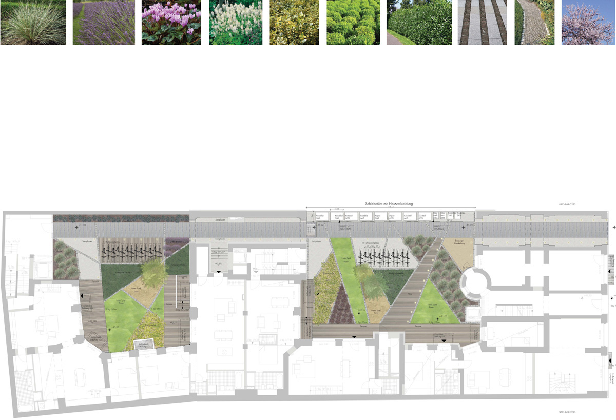 Das 2. Quergebäude schließt das Grundstück als Grenzbebauung ab, sodass sich dessen Innenräume einseitig zum zweiten Hof hin orientieren.