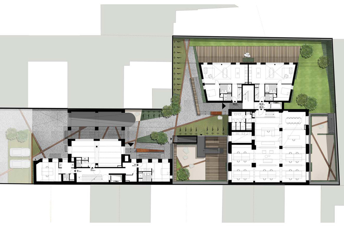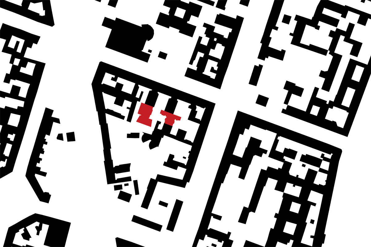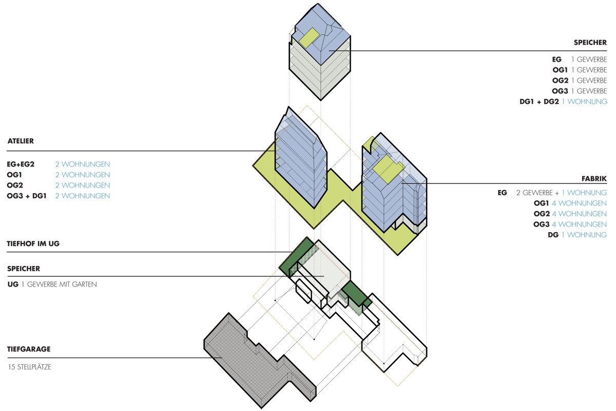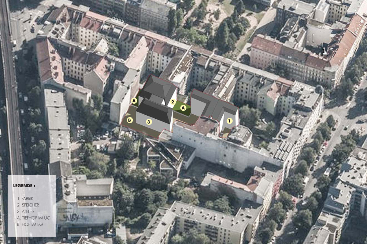 Ziel der von uns vorgesehenen Eingriffe in die bestehende Struktur ist die Entwicklung einer prägnante Adresse. Nach Abbruch der Lager und Garagen sowie dem dreigeschossigen Zwischenbau entsteht im Hof mit den drei Häusern Fabrik, Speicher und neuem Atelier ein Ensemble mit städtischem Garten, der die Höfe zu den Nachbarn hin großzügig öffnet.