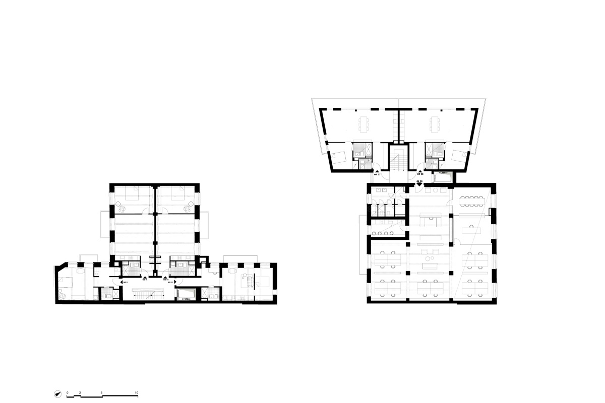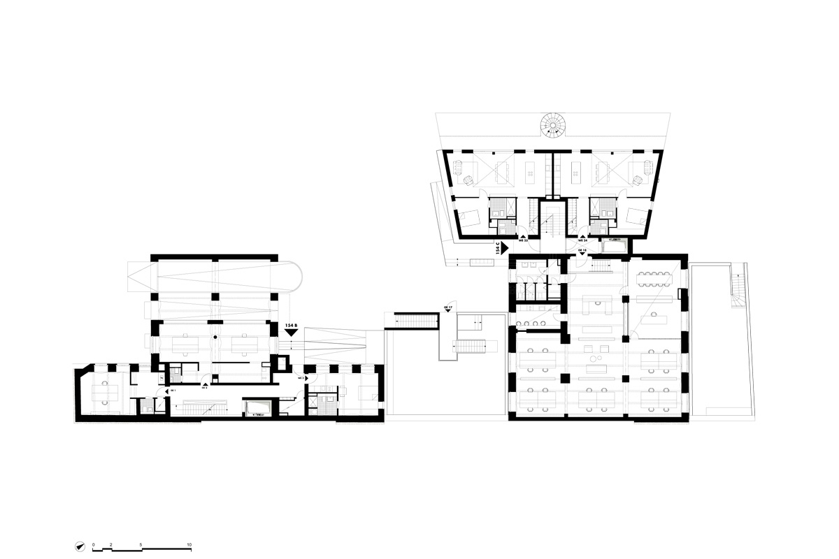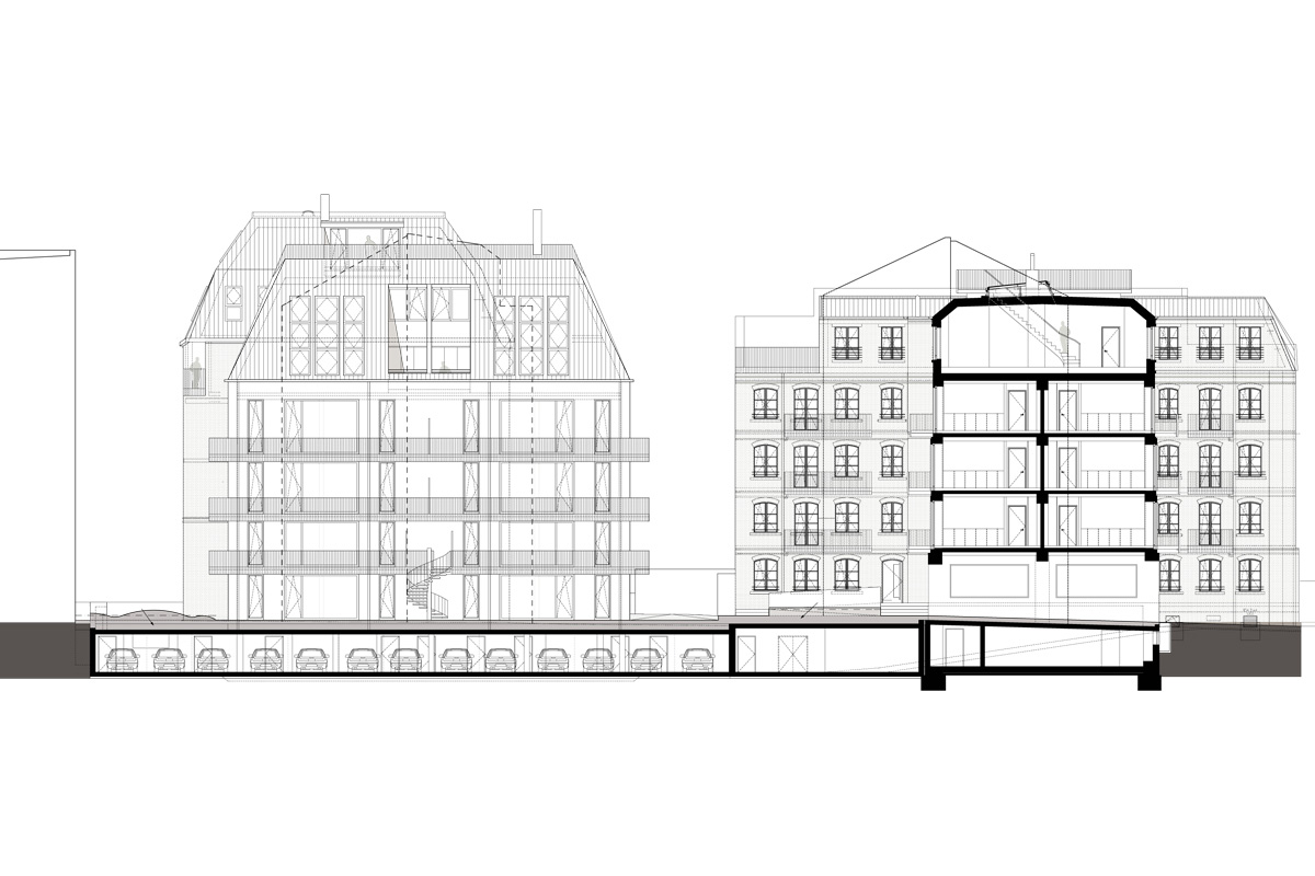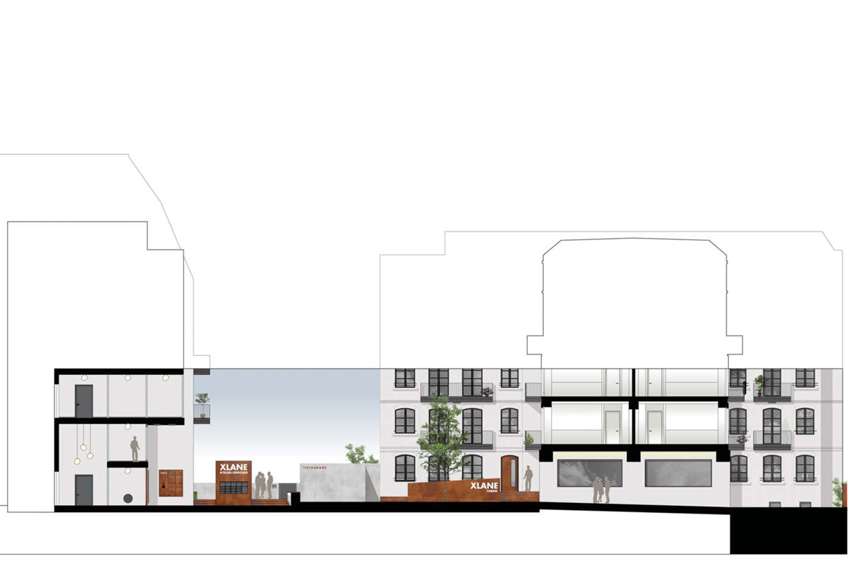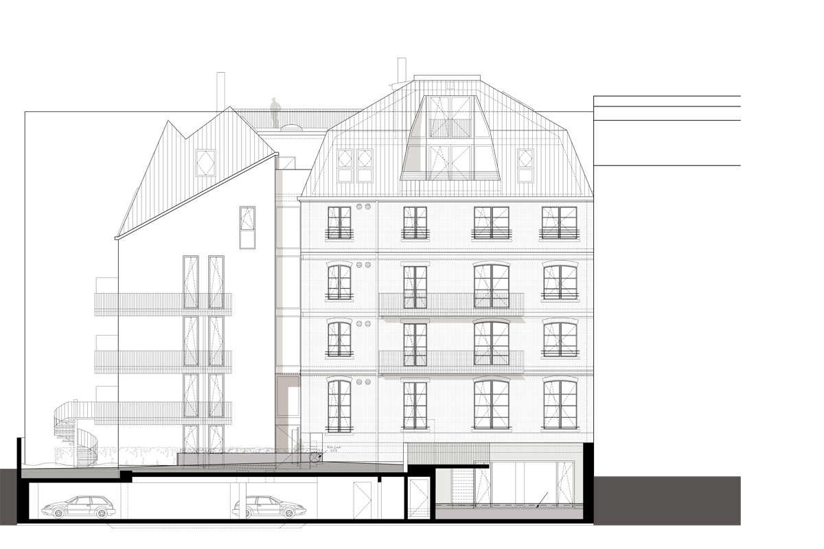 Ziel der von uns vorgesehenen Eingriffe in die bestehende Struktur ist die Entwicklung einer prägnante Adresse. Nach Abbruch der Lager und Garagen sowie dem dreigeschossigen Zwischenbau entsteht im Hof mit den drei Häusern Fabrik, Speicher und neuem Atelier ein Ensemble mit städtischem Garten, der die Höfe zu den Nachbarn hin großzügig öffnet.
