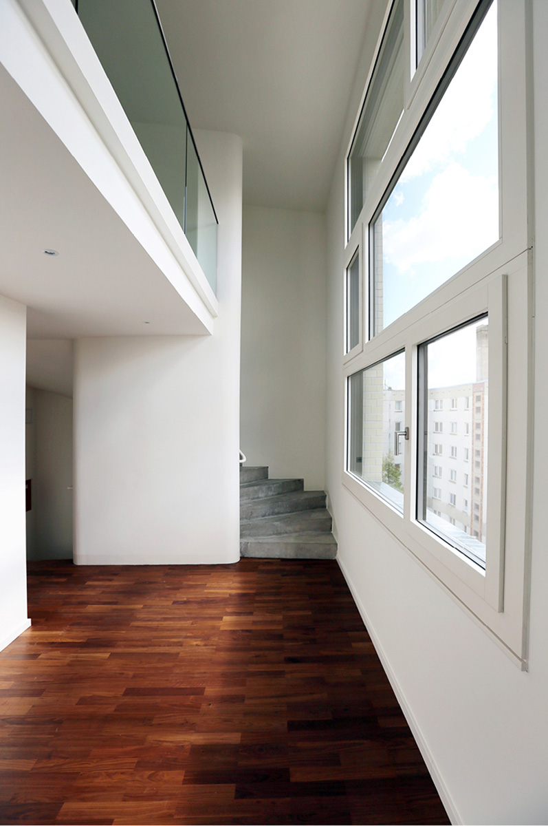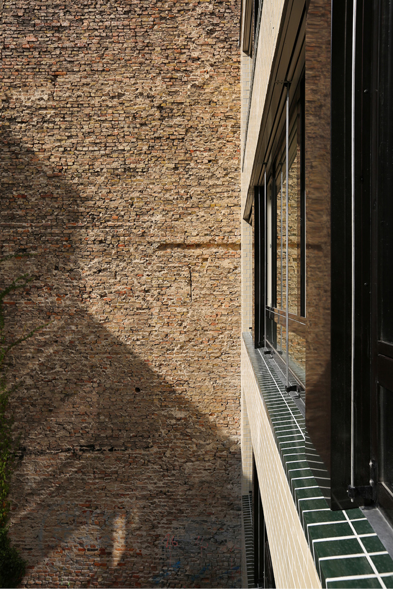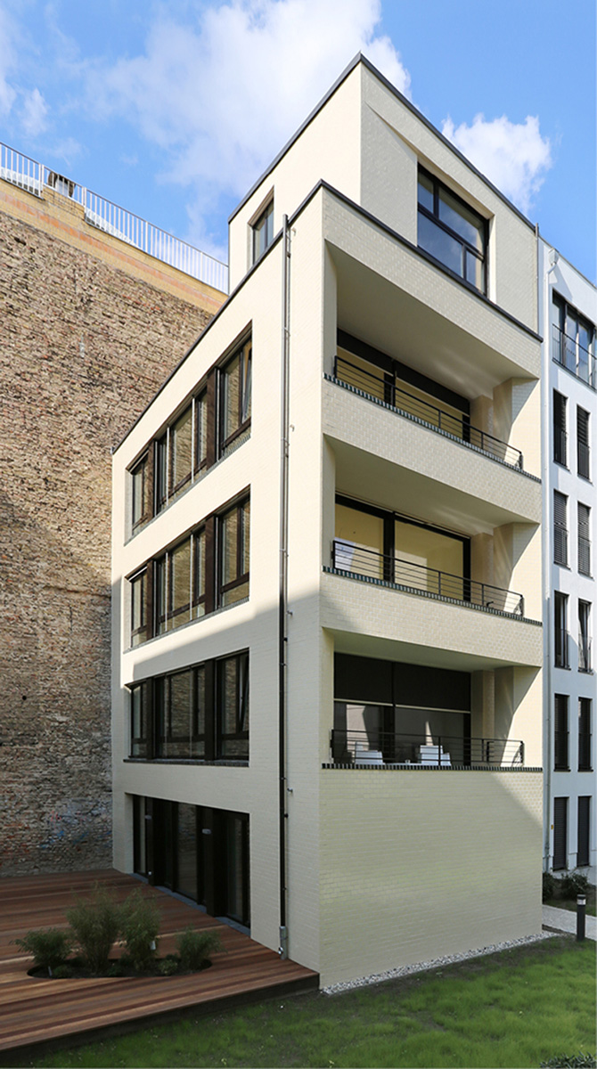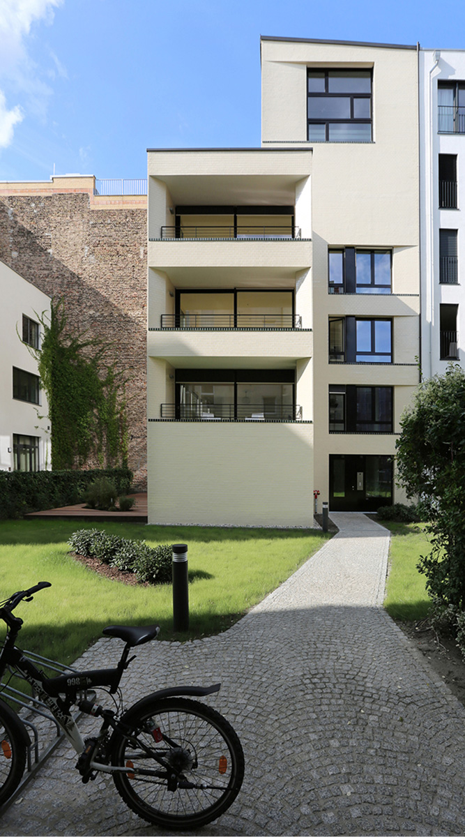 Gliederung und Gestaltung der Fassade betonen die Zusammengehörigkeit von „Turm“ und „Remise“: Große Loggien und Fenster mit niedrigen Brüstungen öffnen die Regelgeschosse nach Süden; die oberen drei Geschosse der Triplexwohnung haben ein gemeinsames „Turmfenster“ im Bereich der zweigeschossigen Galerieebene. Die mit weißem glasiertem Klinker verkleidete Fassade ruft vertraute Assoziationen ab – Berlins historische Gewerbehöfe – und übersetzt diese in einen neuen Kontext. Im Zusammenspiel mit den modernen, großzügigen Fensterformaten und den flaschengrünen Fensterbänken entsteht so ein Haus im Hof, das sich sowohl gut in die Hofbebauung einfügt als auch eine von der Straße gut sichtbare städtische Adresse umsetzt.