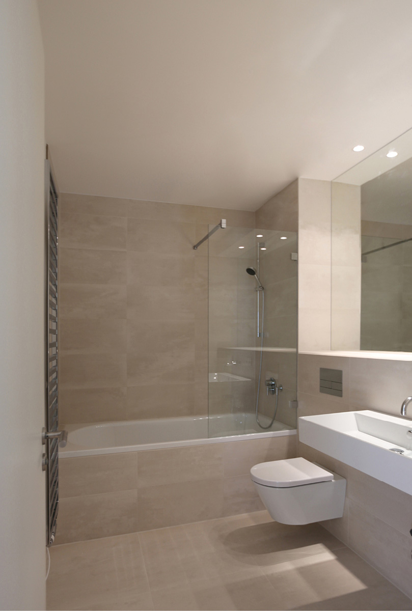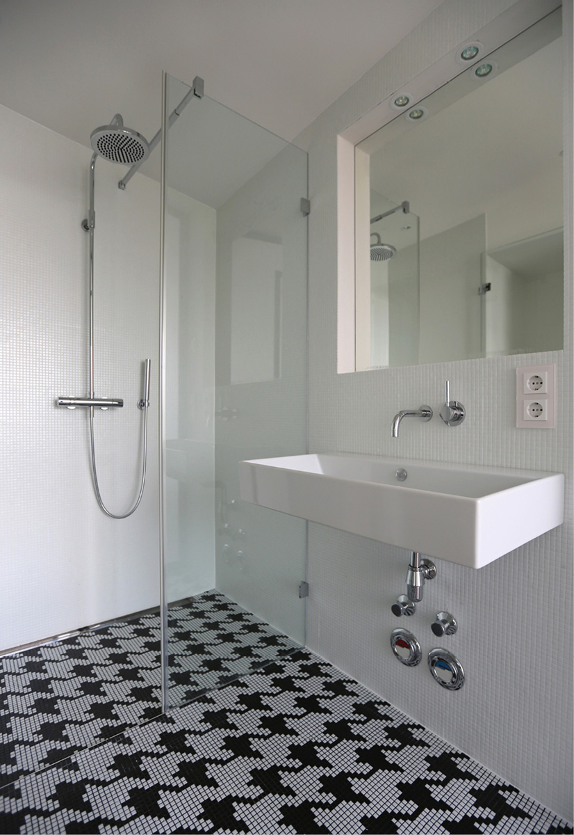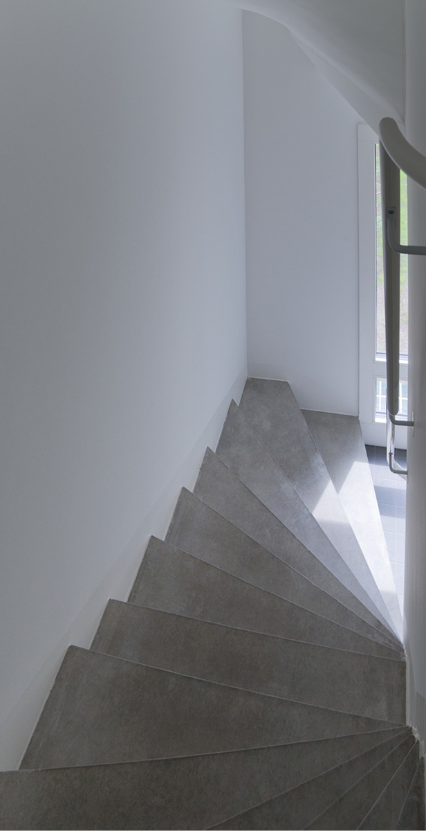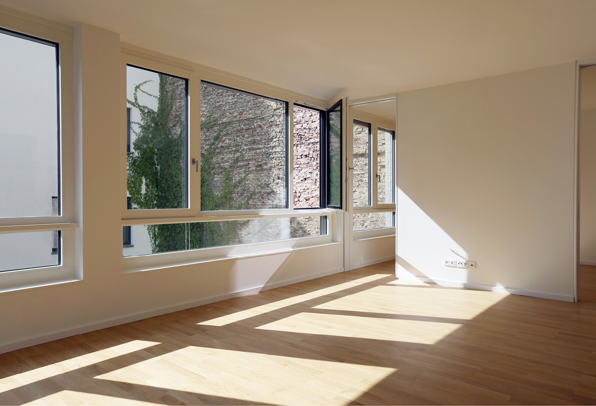 Gliederung und Gestaltung der Fassade betonen die Zusammengehörigkeit von „Turm“ und „Remise“: Große Loggien und Fenster mit niedrigen Brüstungen öffnen die Regelgeschosse nach Süden; die oberen drei Geschosse der Triplexwohnung haben ein gemeinsames „Turmfenster“ im Bereich der zweigeschossigen Galerieebene. Die mit weißem glasiertem Klinker verkleidete Fassade ruft vertraute Assoziationen ab – Berlins historische Gewerbehöfe – und übersetzt diese in einen neuen Kontext. Im Zusammenspiel mit den modernen, großzügigen Fensterformaten und den flaschengrünen Fensterbänken entsteht so ein Haus im Hof, das sich sowohl gut in die Hofbebauung einfügt als auch eine von der Straße gut sichtbare städtische Adresse umsetzt.