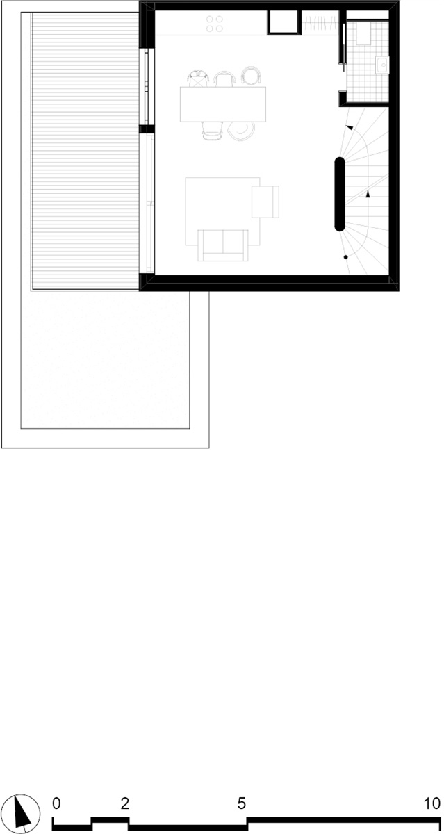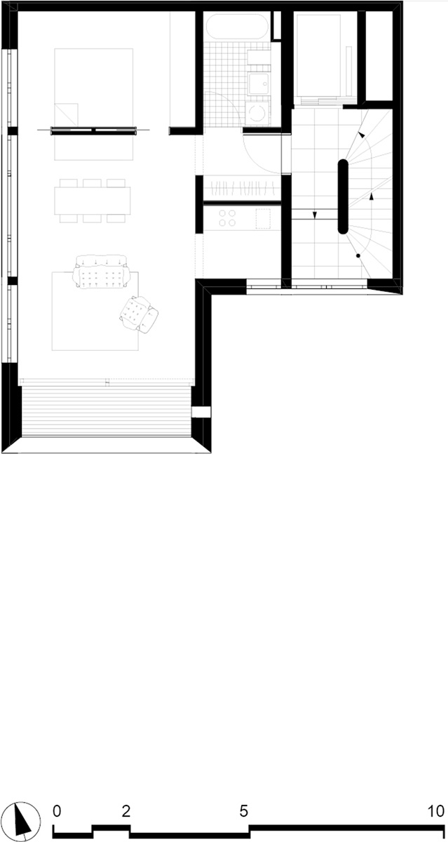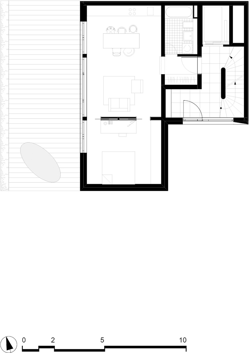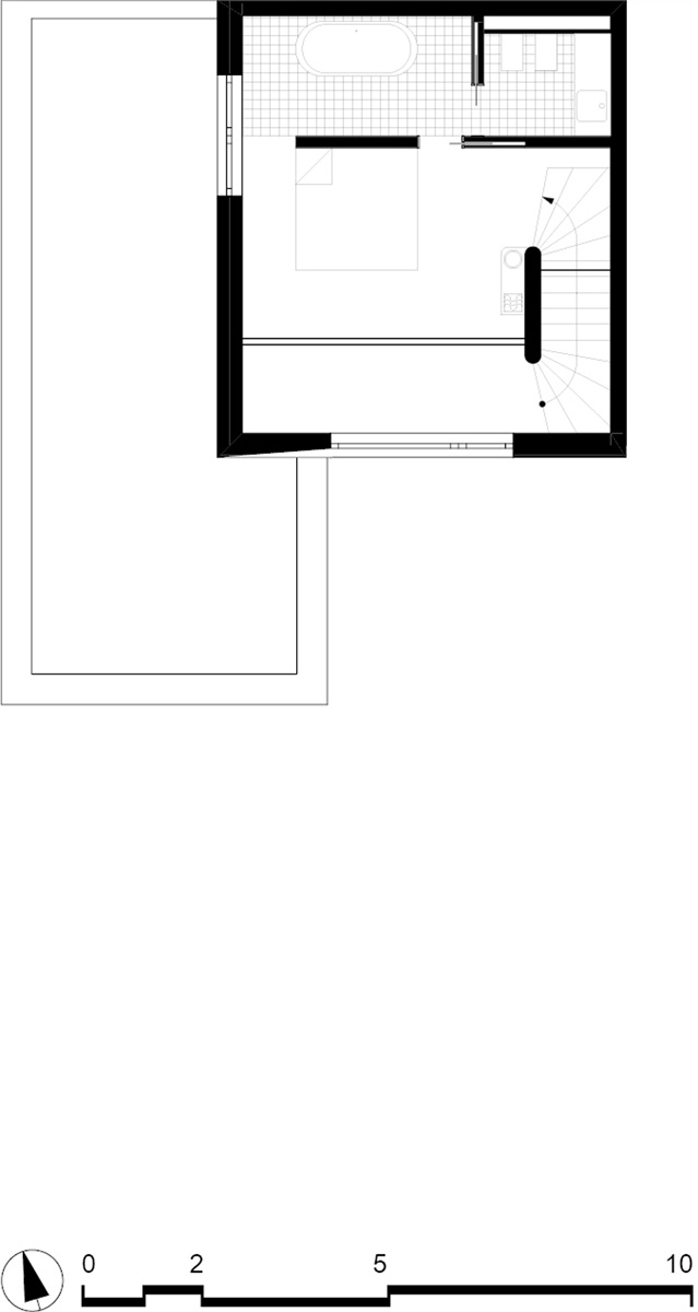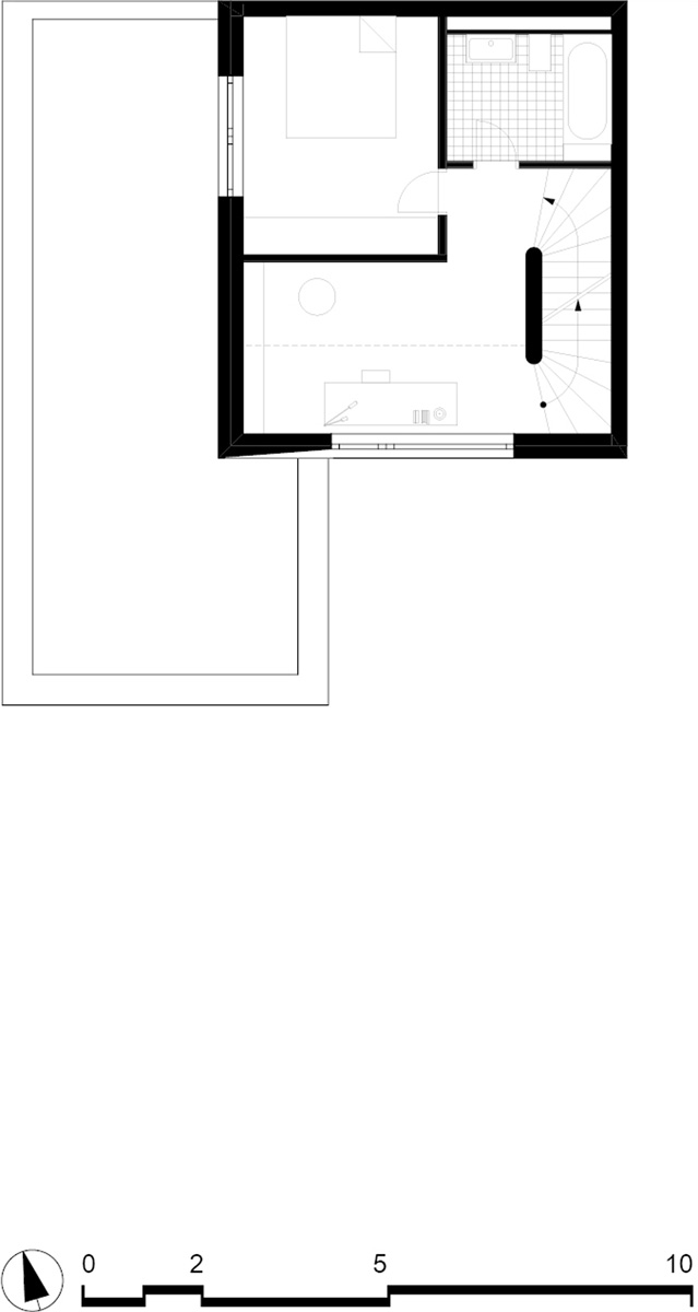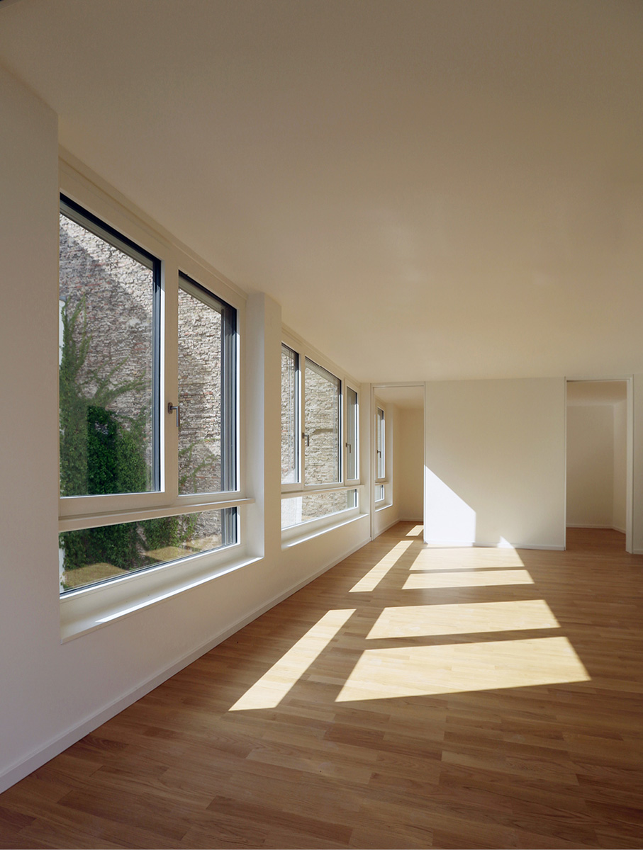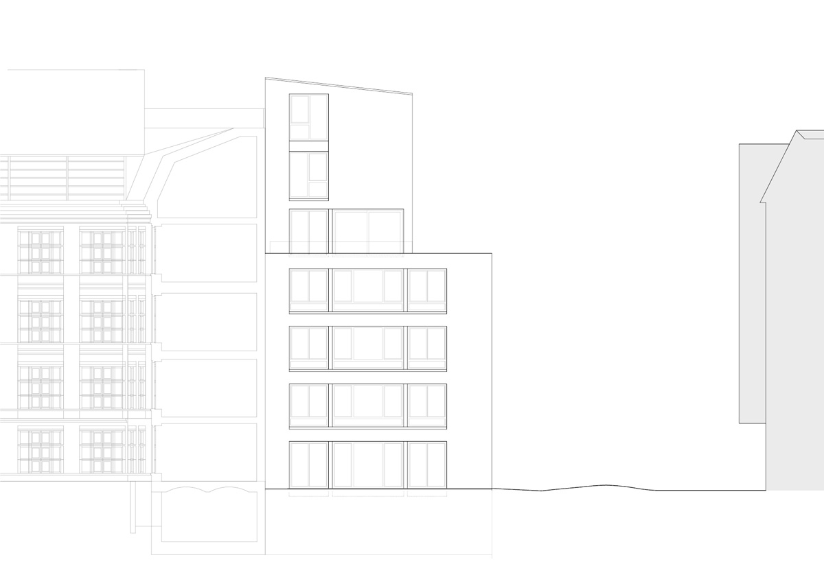 Städtebaulich haben wir zwei ineinander verschränkte Baukörper platziert: einen schlanken, hohen, turmartigen und einen niedrigen, flachen, remisenartigen Körper. Das Spannungspaar formt auf der einen Seite einen intimen Gartenraum mit dem Nachbarn zur Straße und öffnet sich auf der anderen zur Auguststraße hin und in den Hof hinein.