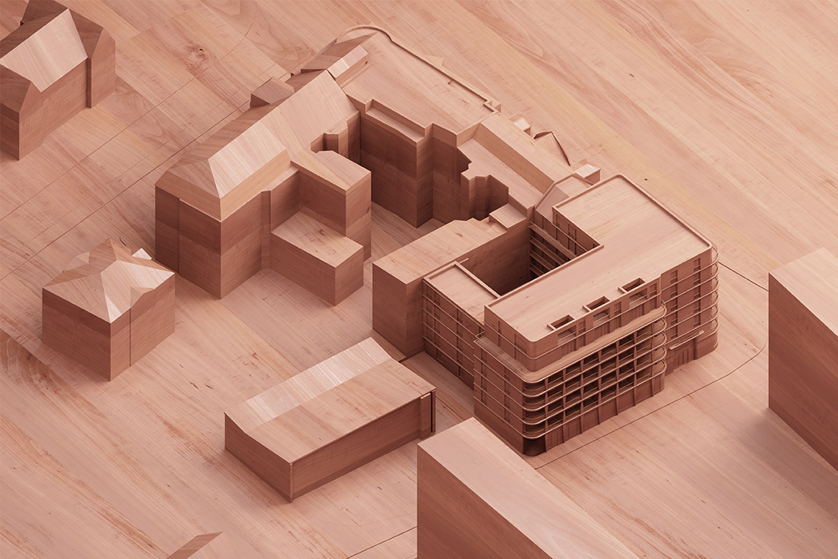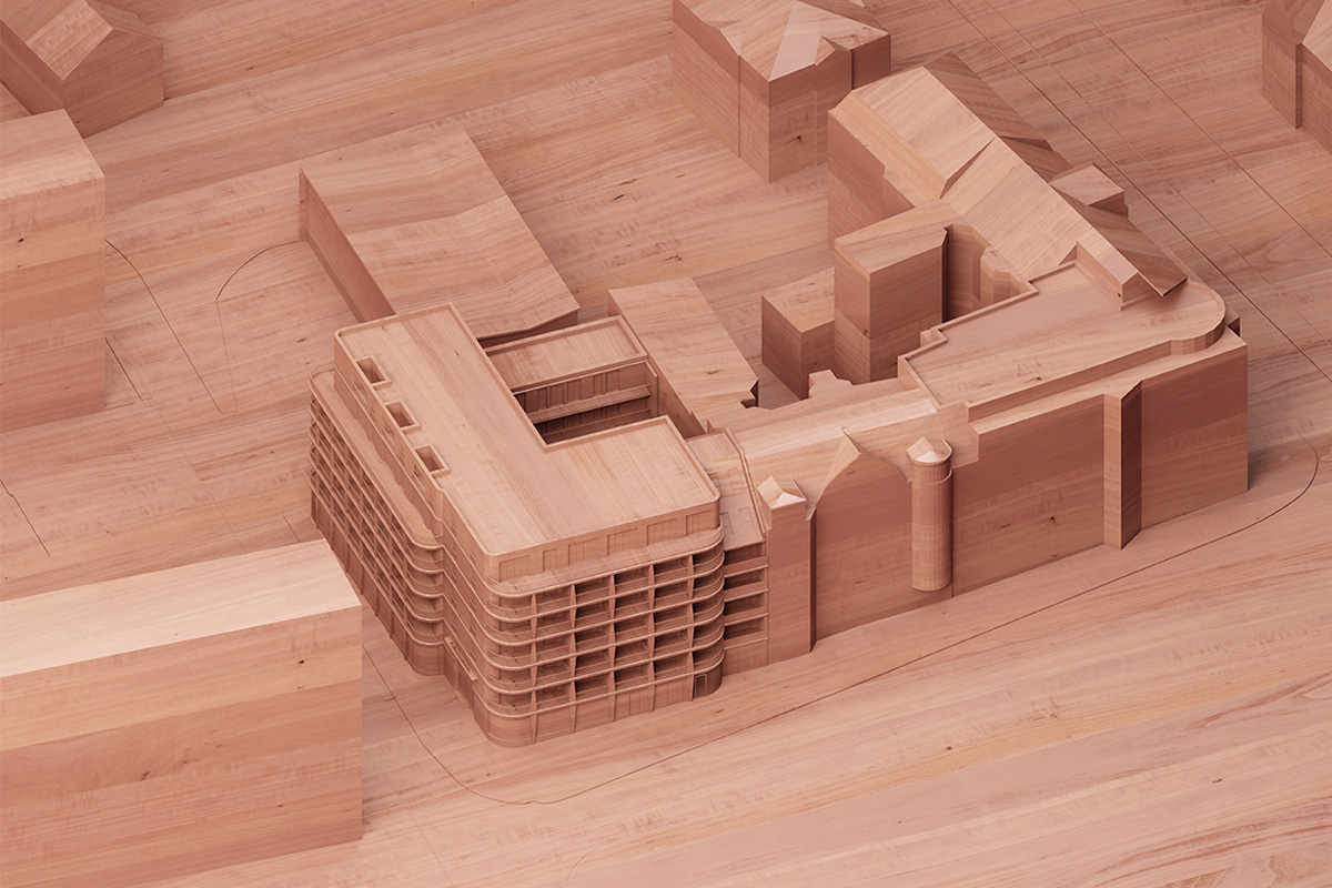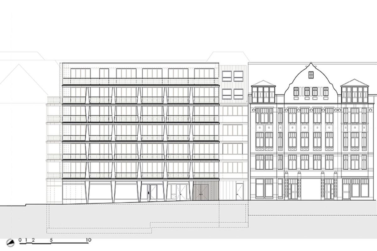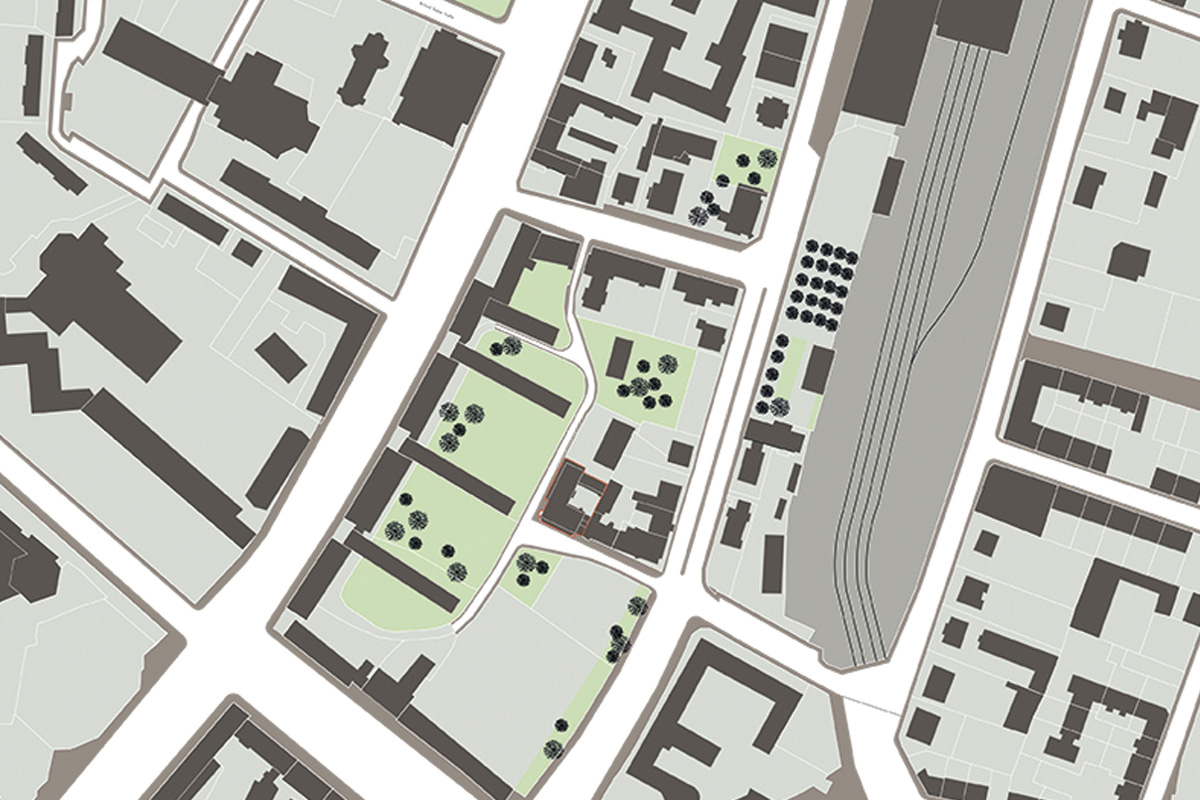 Unsere Idee für die Waisenstraße ist für die Eckparzelle die Umsetzung einer selbstbewussten Stadtecke nach Südwesten, die den Übergang zum historischen Wohn- und Geschäftshaus spiegelbildlich zum Neubau an der Straßenecke zur Bahnhofsstraße formuliert