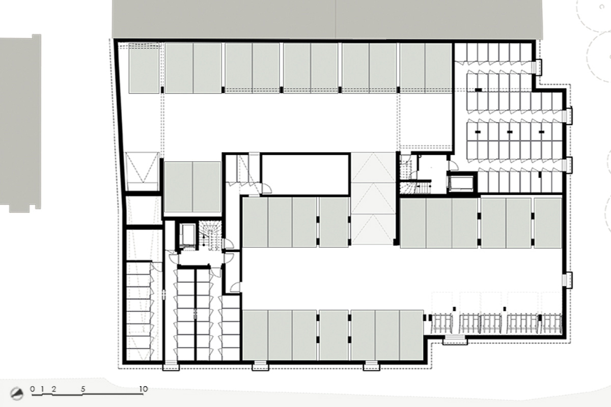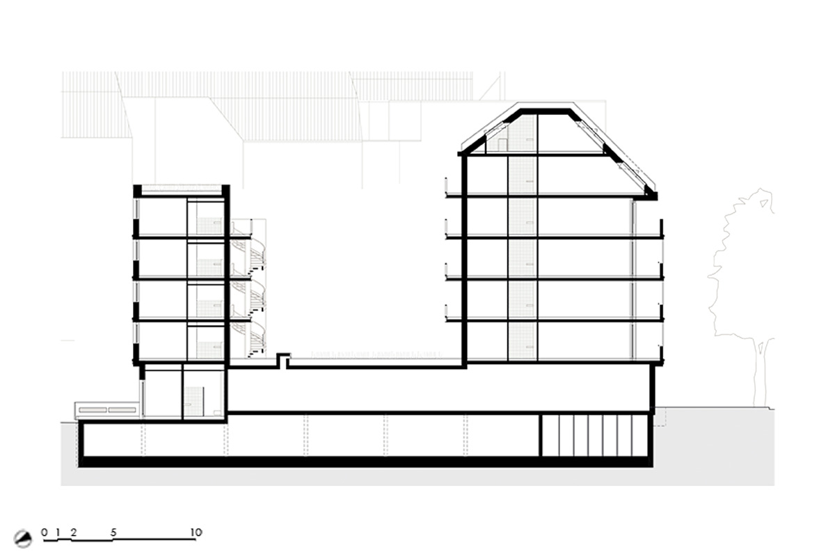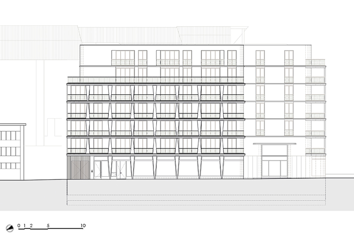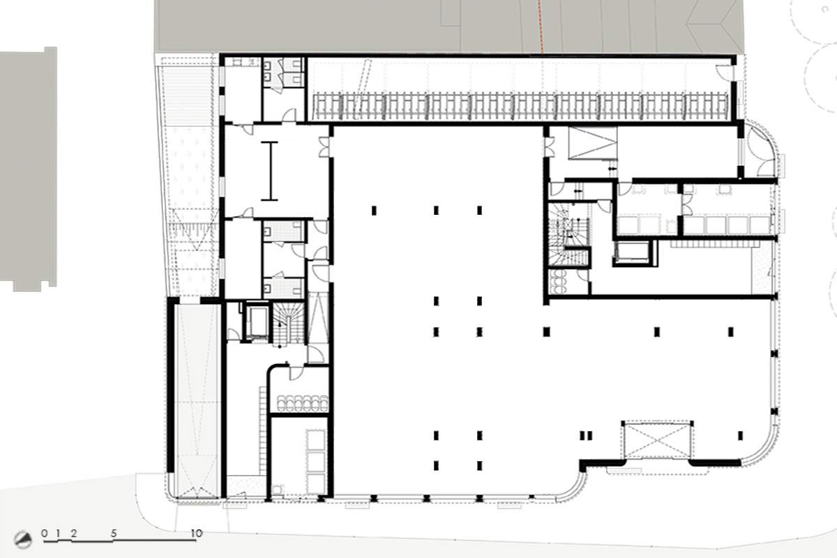 Der Erdgeschosssockel ist mit klassisch hohen Proportionen ausgebildet und erstreckt sich als Einzelhandelsfläche für Lebensmittel über nahezu das gesamte Erdgeschoss – funktional gewissermaßen als Nachfolger der ehemaligen Kaufhalle. Die Schaufenster sind aus Aluminium und bronzefarbenen bepulvert.