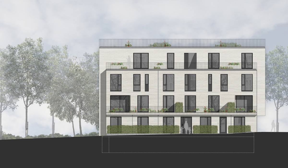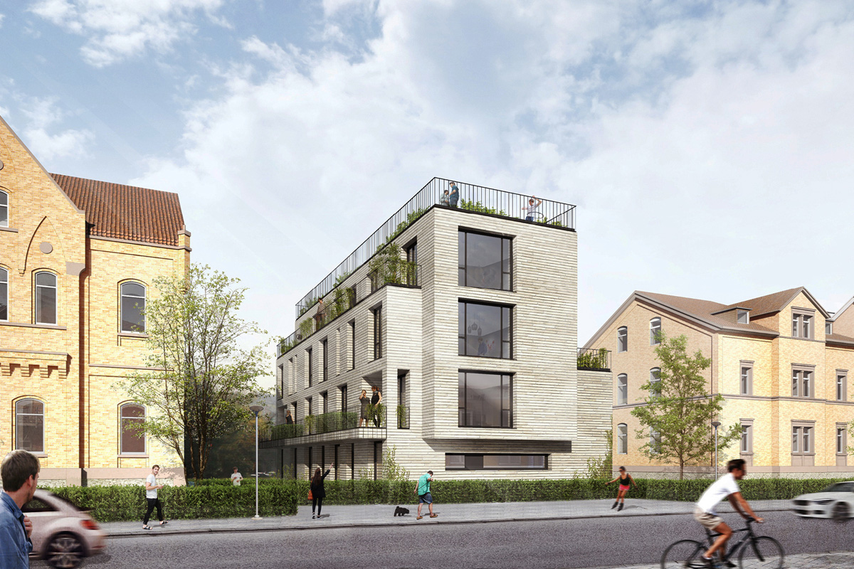 Das Haus in der Wöhlerstraße 7 ist als Wohnhaus mit vier Geschossen und Untergeschoss für zwölf Wohnungen geplant und fügt sich in die bereits vorhandene Bebauung der Nachbarschaft.