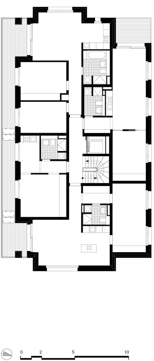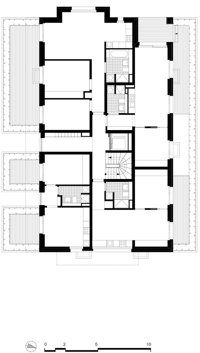Der auskragende Erker interpretiert die benachbarten Mittelrisalite, die gestaffelten Vor- und Rücksprünge nehmen Bezug zu den mitunter ebenfalls gestaffelten Bauten aus dem 19. Jahrhundert.