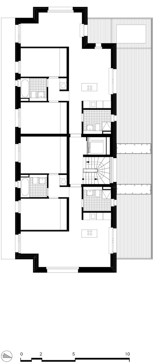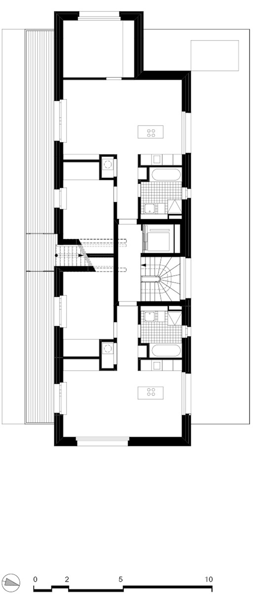 Im Zusammenspiel mit den modernen, großzügigen Fensterformaten und den hellen Backsteinen entsteht so ein Haus, dass sich modern und selbstbewusst in der Nachbarschaft platziert, sich sowohl gut in den Kontext einfügt als auch eine in der Straße markante städtische Adresse umsetzt.