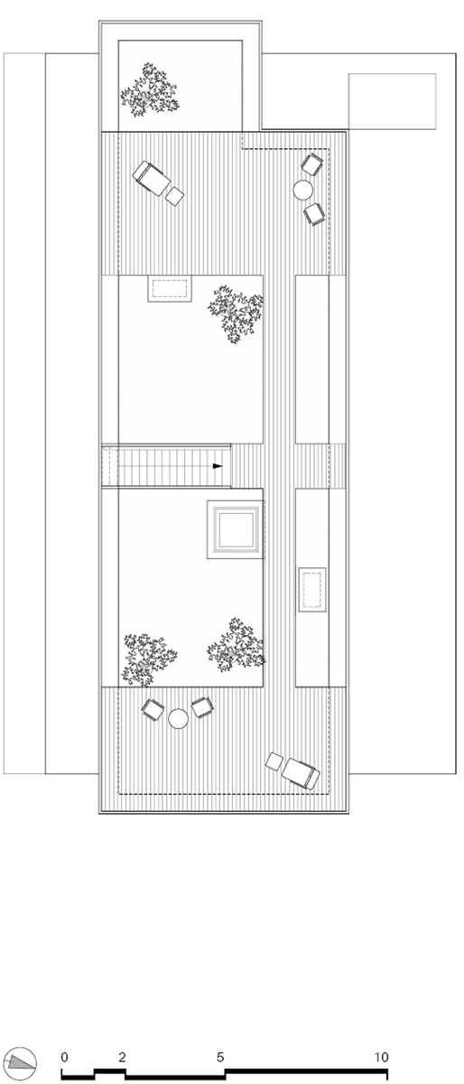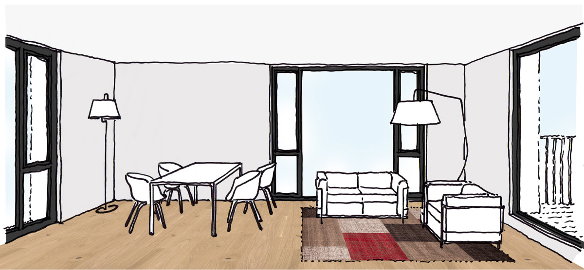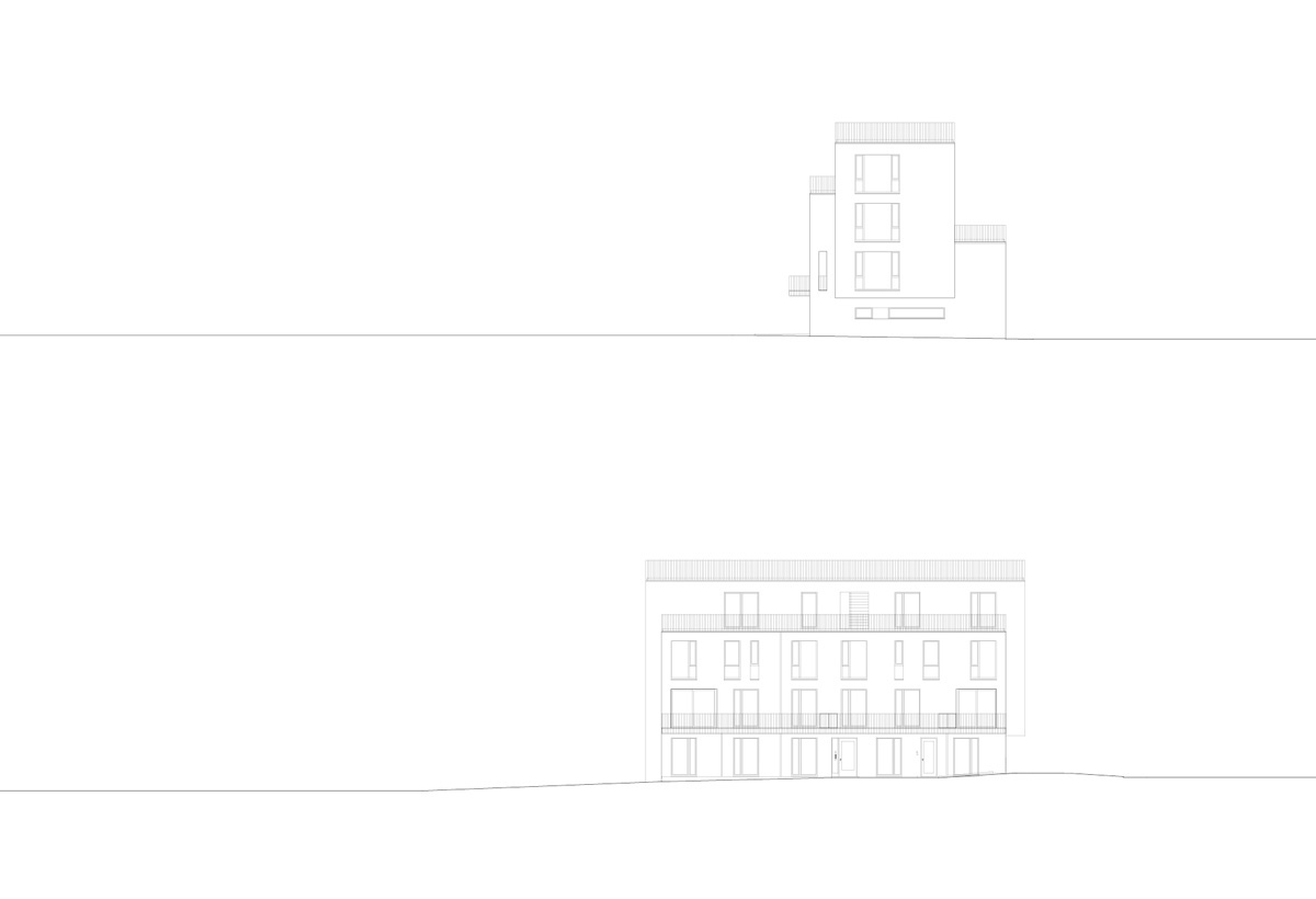 Die Ausbildung der Fassadenstruktur entwickelt sich aus diesen städtebaulichen Gedanken; so gibt es große Öffnungen zur Straße, die sich an den öffentlichen Raum adressieren und großzügige, bodentiefe Fenster, die die Innenräume mit der Gartenlandschaft verbinden.
