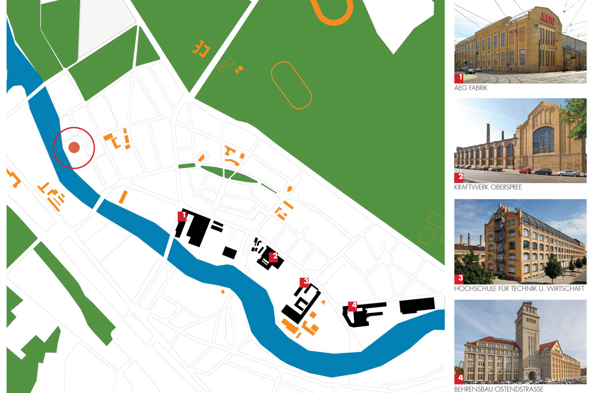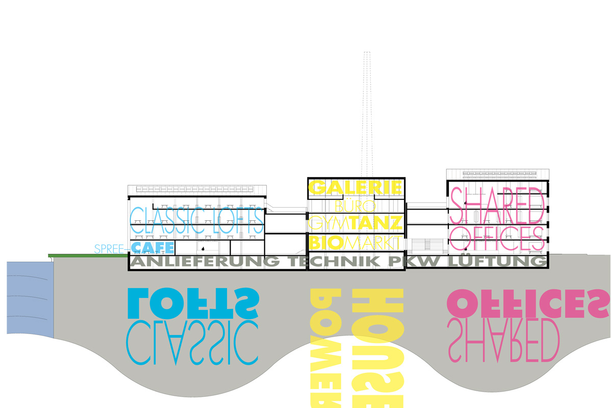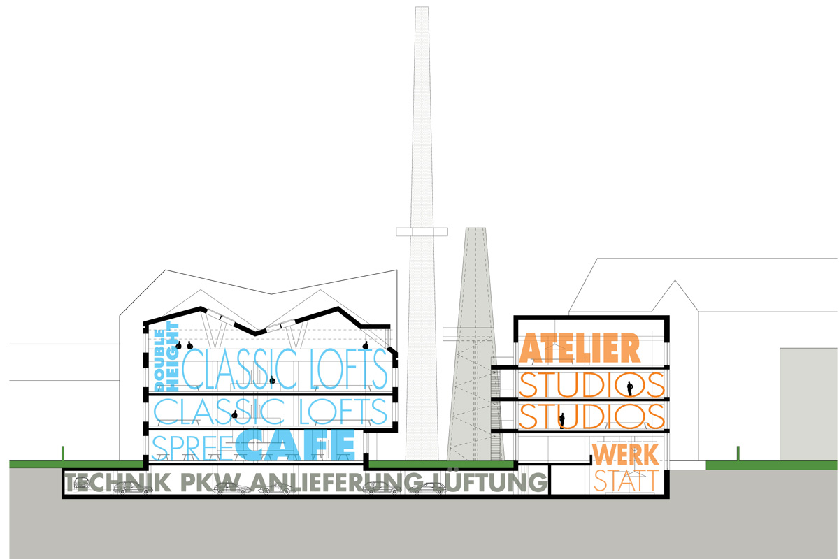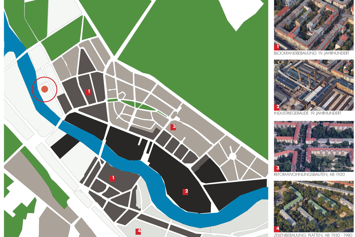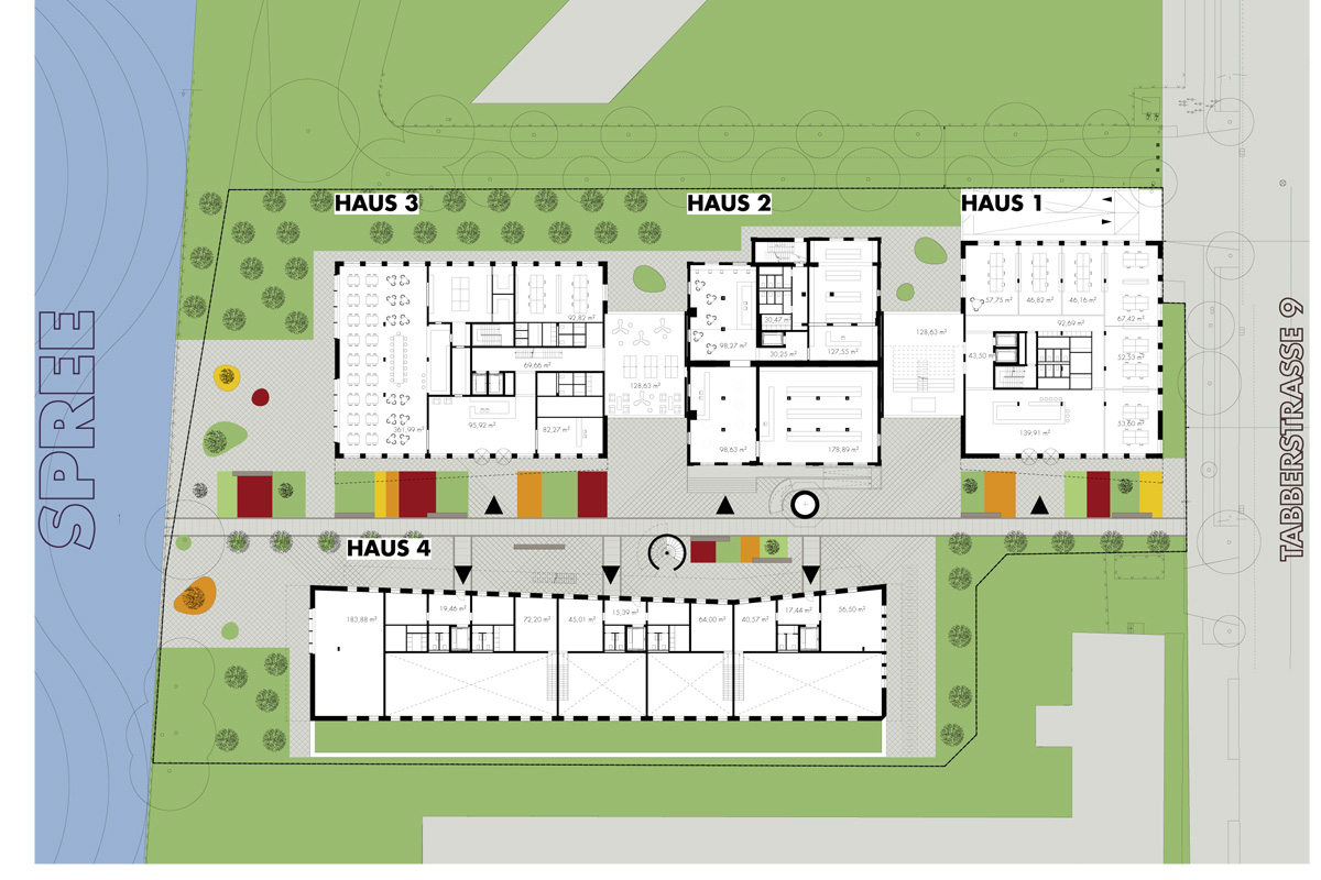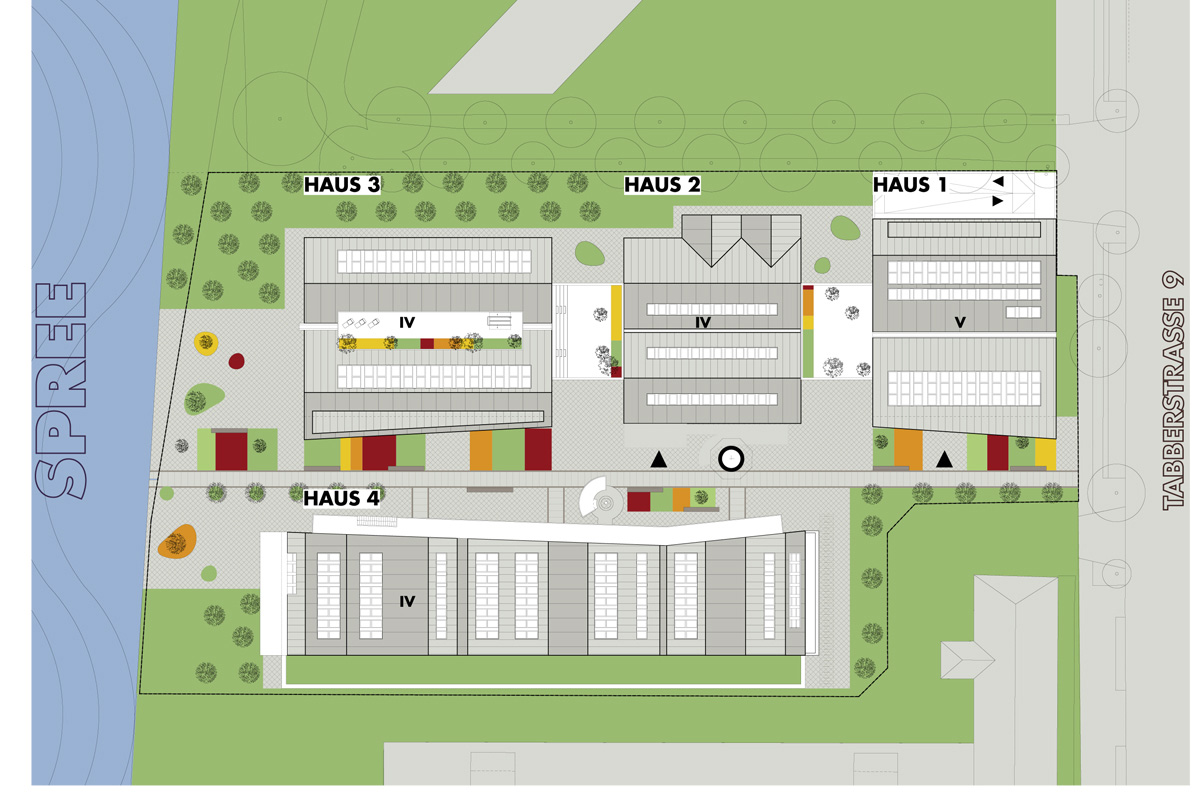 Nach Einbindung der Bestandsgebäude in das städtebauliche Konzept entsteht mit den vier Häusern ein Ensemble mit urbanen Plätzen an Straße und Spree und einem Erschließungsgarten mit altem Schlot und neuem Treppenturm mit Aussichtsplattform.
