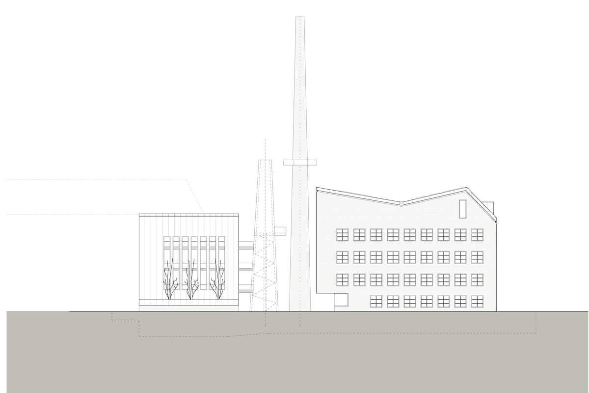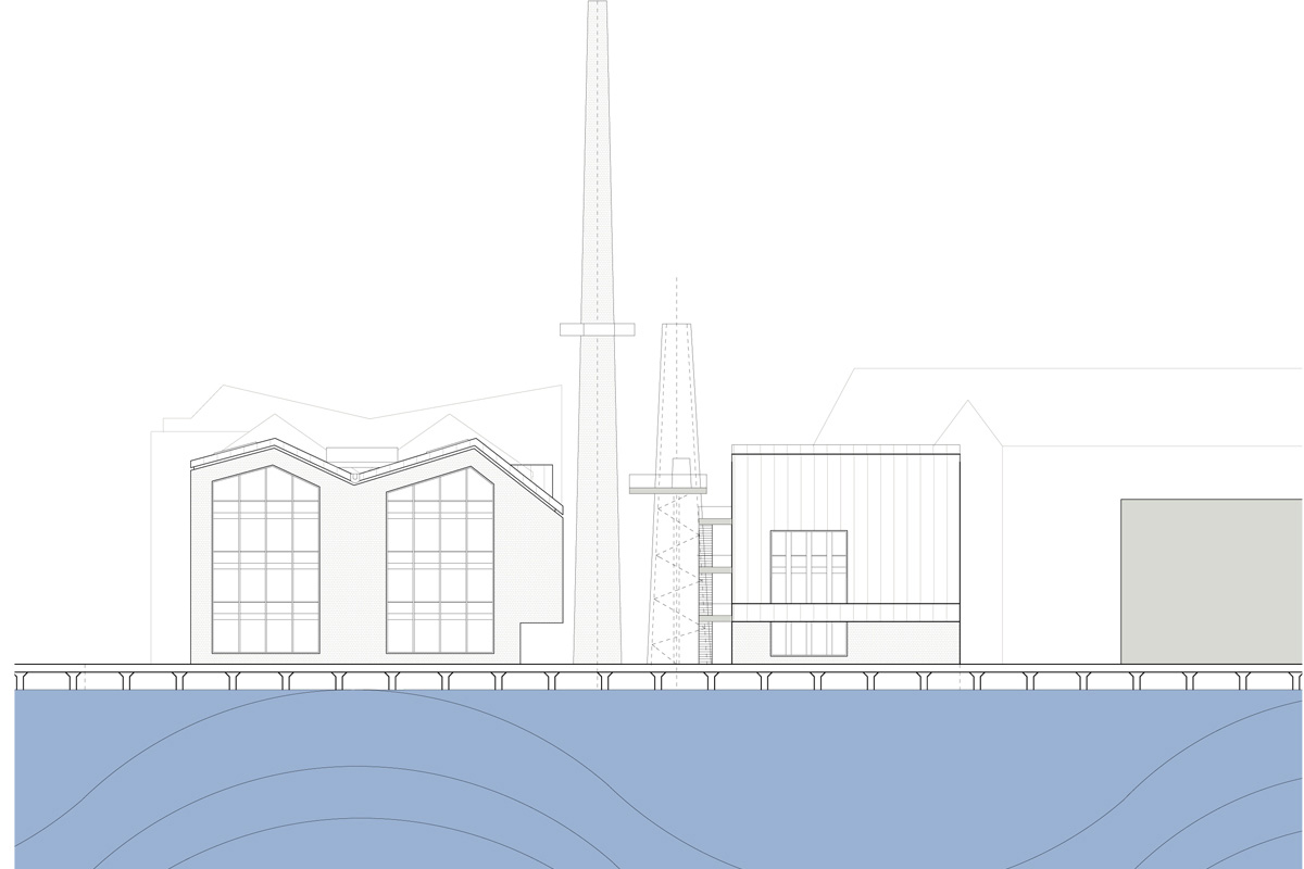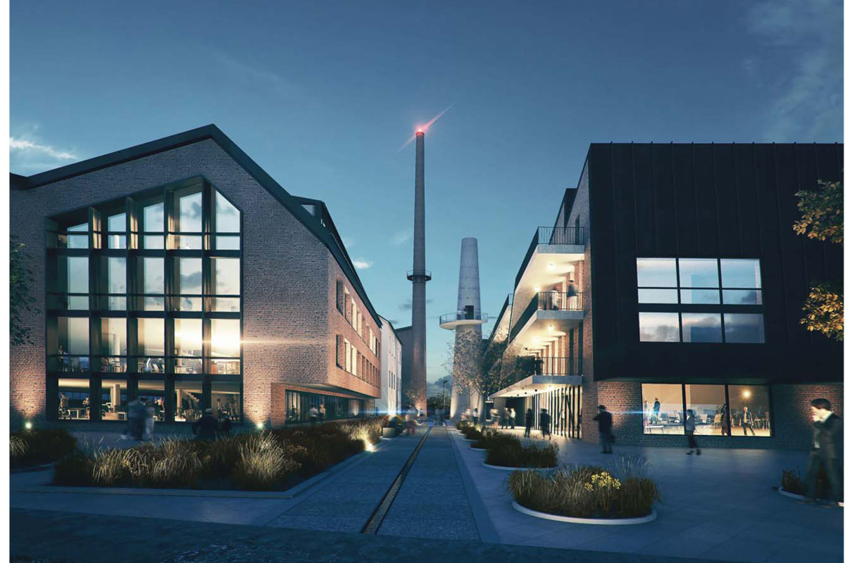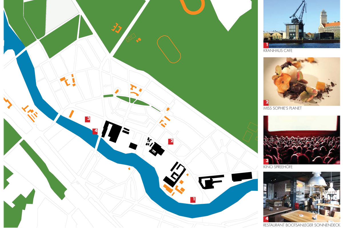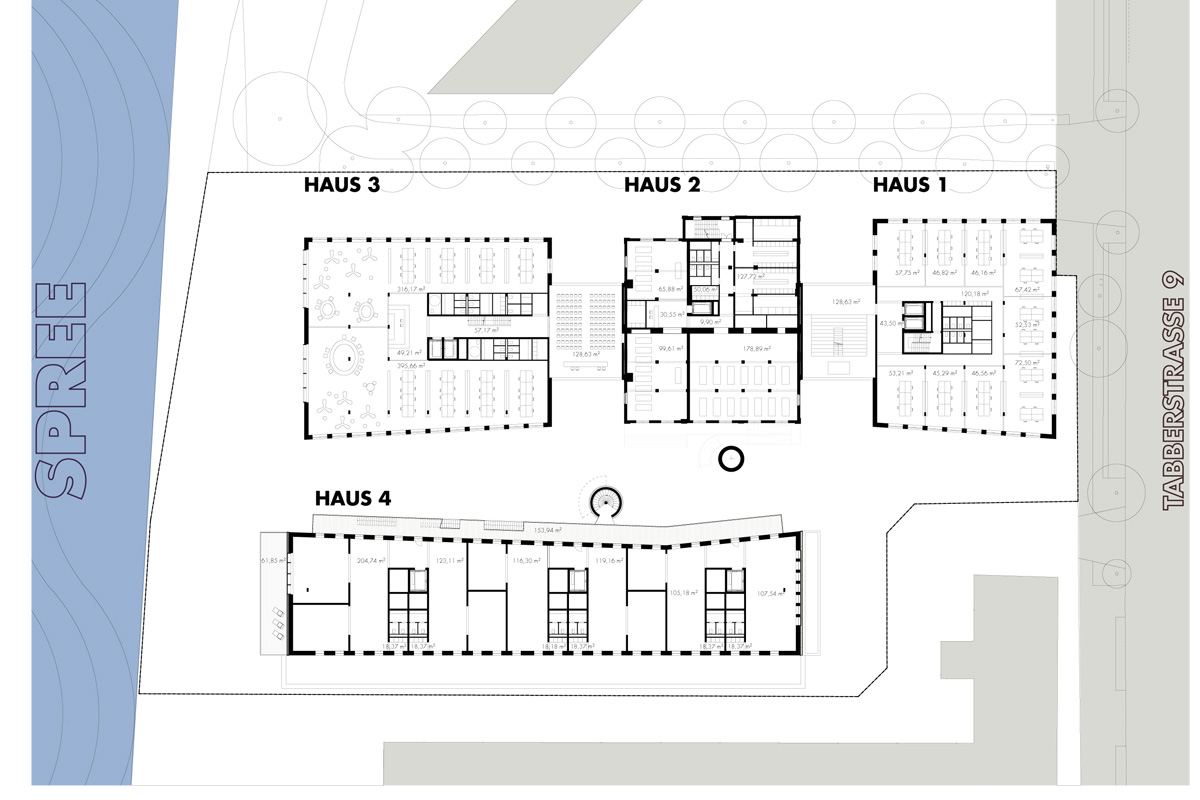 Nach Einbindung der Bestandsgebäude in das städtebauliche Konzept entsteht mit den vier Häusern ein Ensemble mit urbanen Plätzen an Straße und Spree und einem Erschließungsgarten mit altem Schlot und neuem Treppenturm mit Aussichtsplattform.