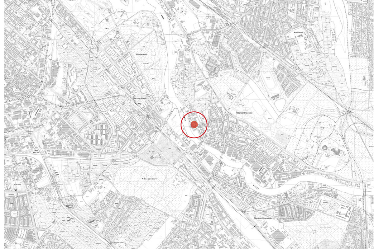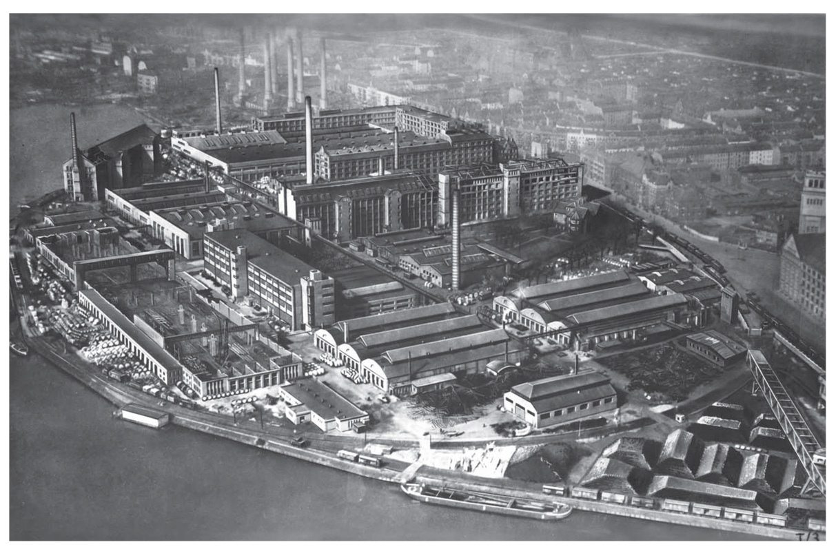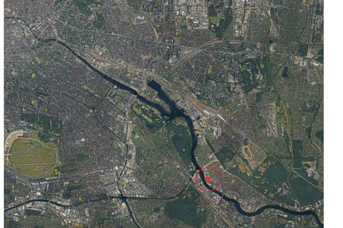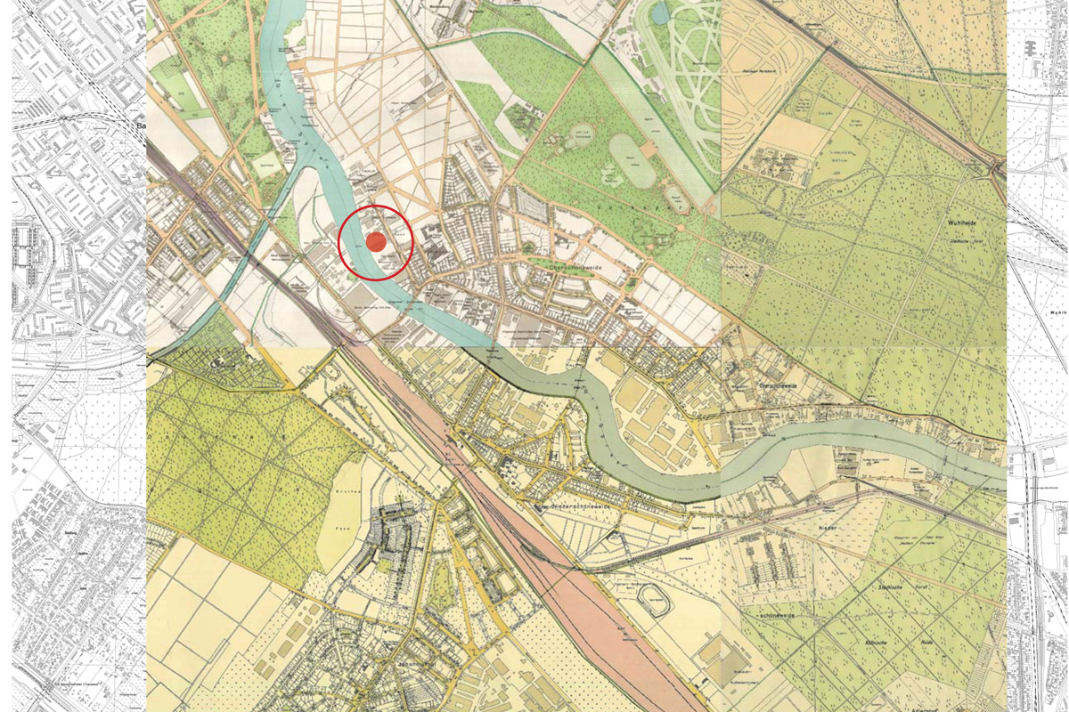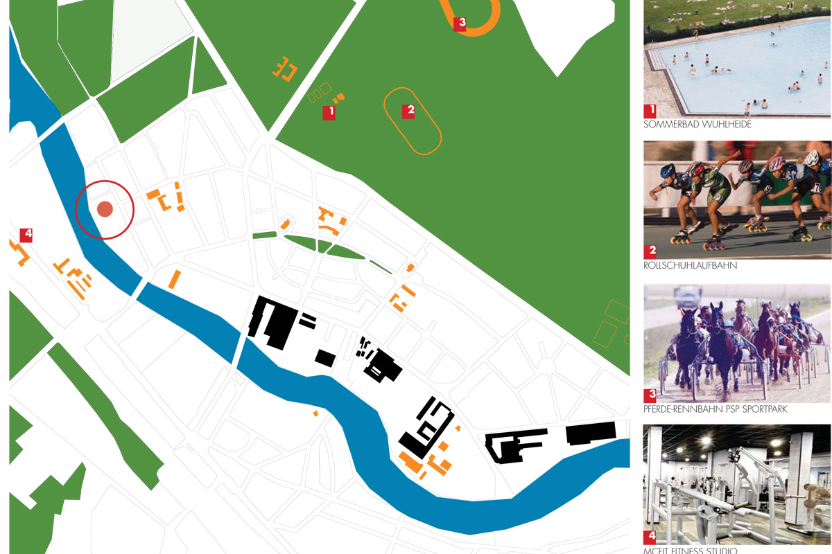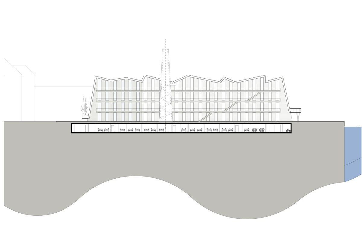Nach Einbindung der Bestandsgebäude in das städtebauliche Konzept entsteht mit den vier Häusern ein Ensemble mit urbanen Plätzen an Straße und Spree und einem Erschließungsgarten mit altem Schlot und neuem Treppenturm mit Aussichtsplattform.