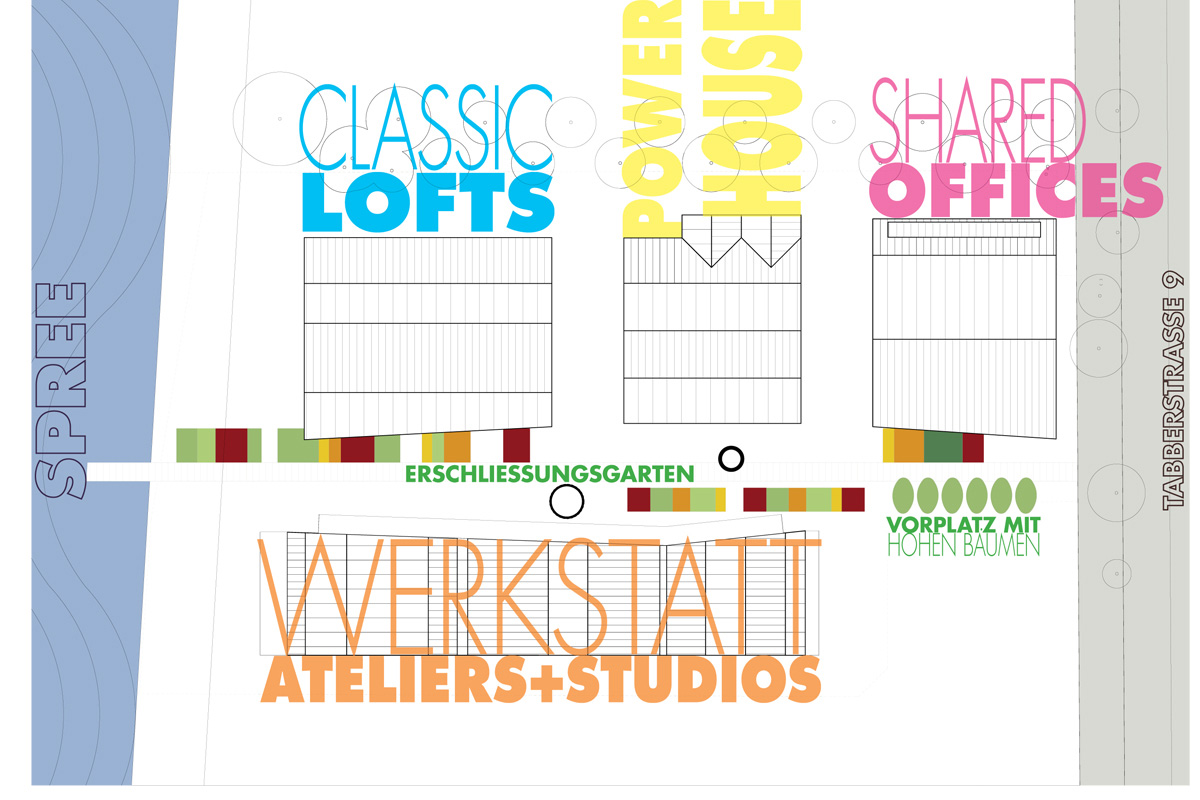 Ziel des Nutzungsprogramms ist, Räume mit Strukturen unterschiedlicher Größe und Beschaffenheit anzubieten, sodass auch die Nutzung unterschiedlicher Tätigkeiten über den ganzen Tag bis in den Abend hinein den gewünschten Geist des Ortes prägen und Synergien für diesen revitalisierten Ort für kreative Arbeitsräume realisiert werden können.
