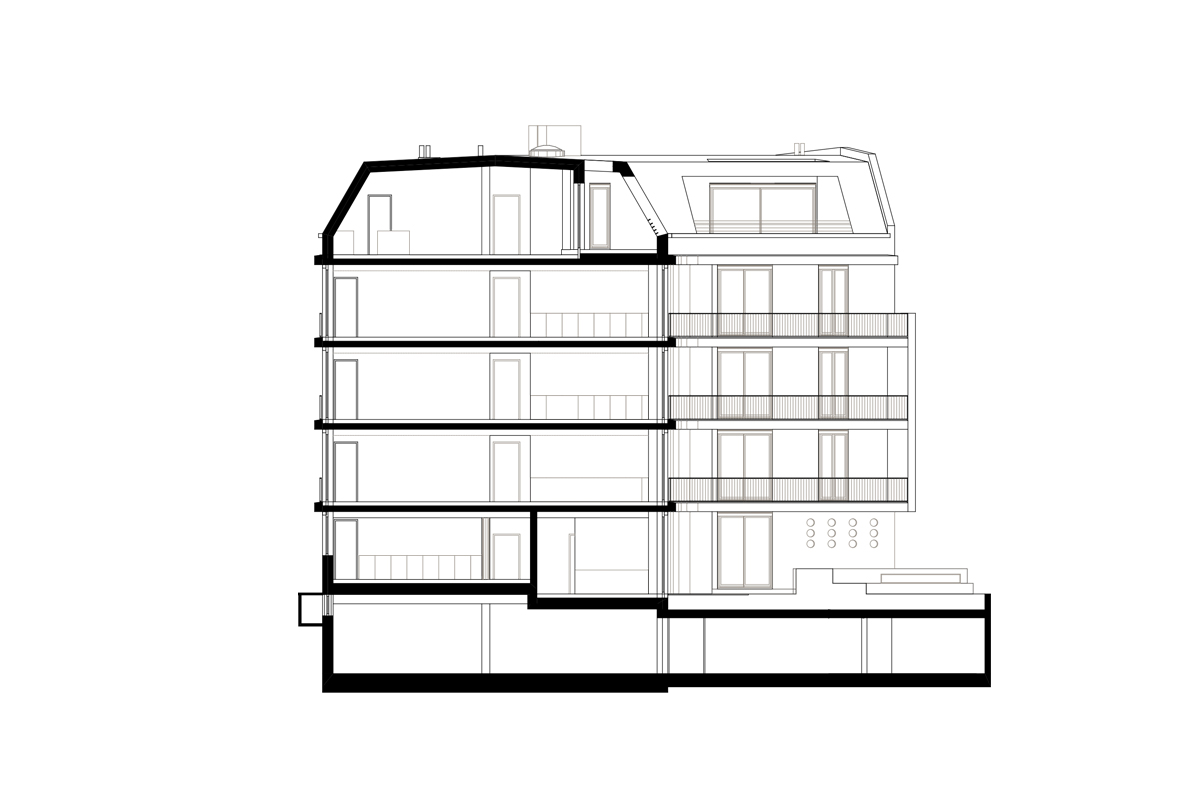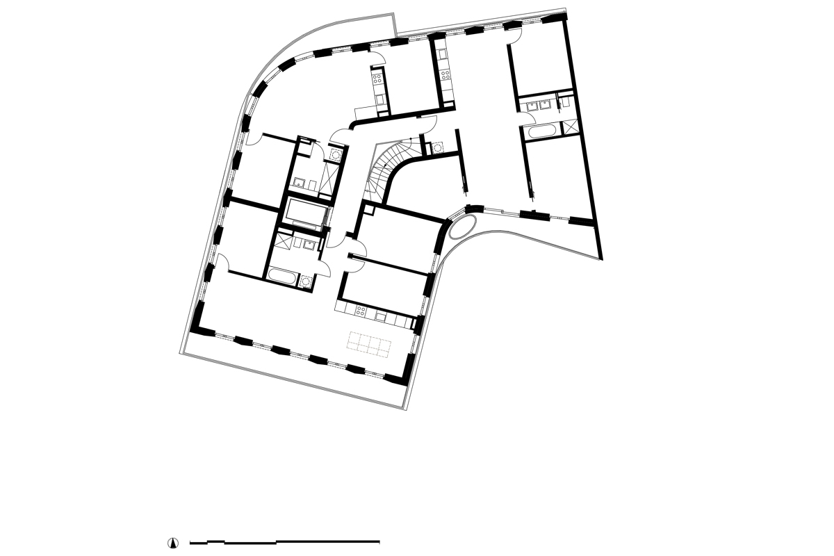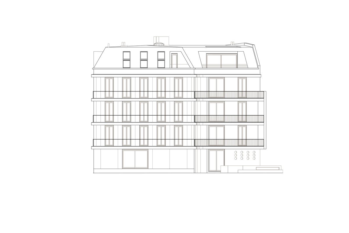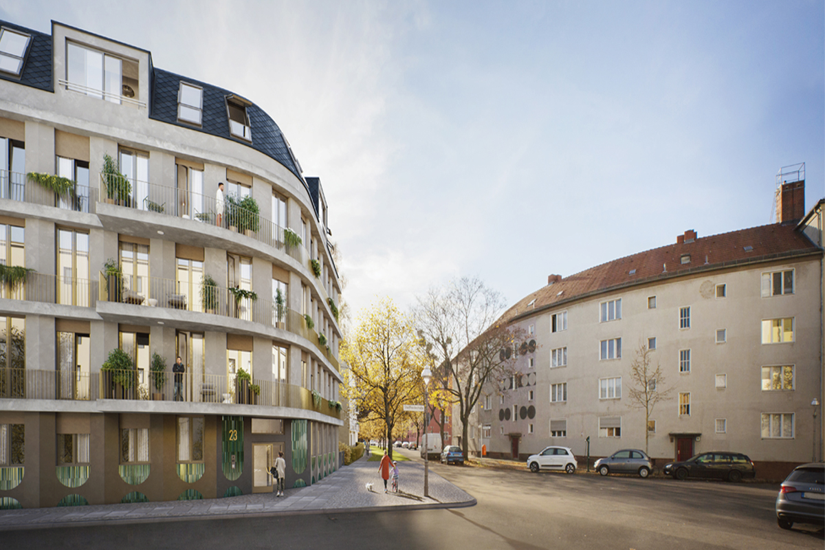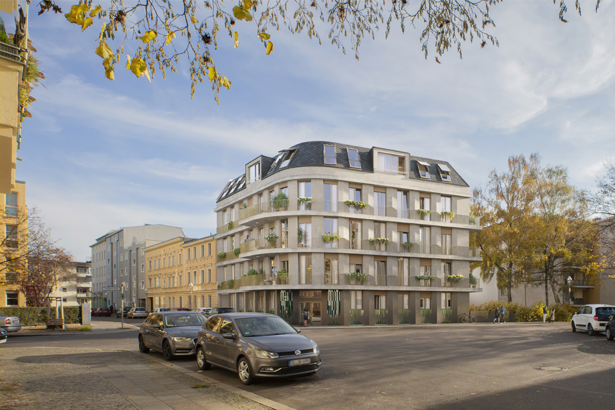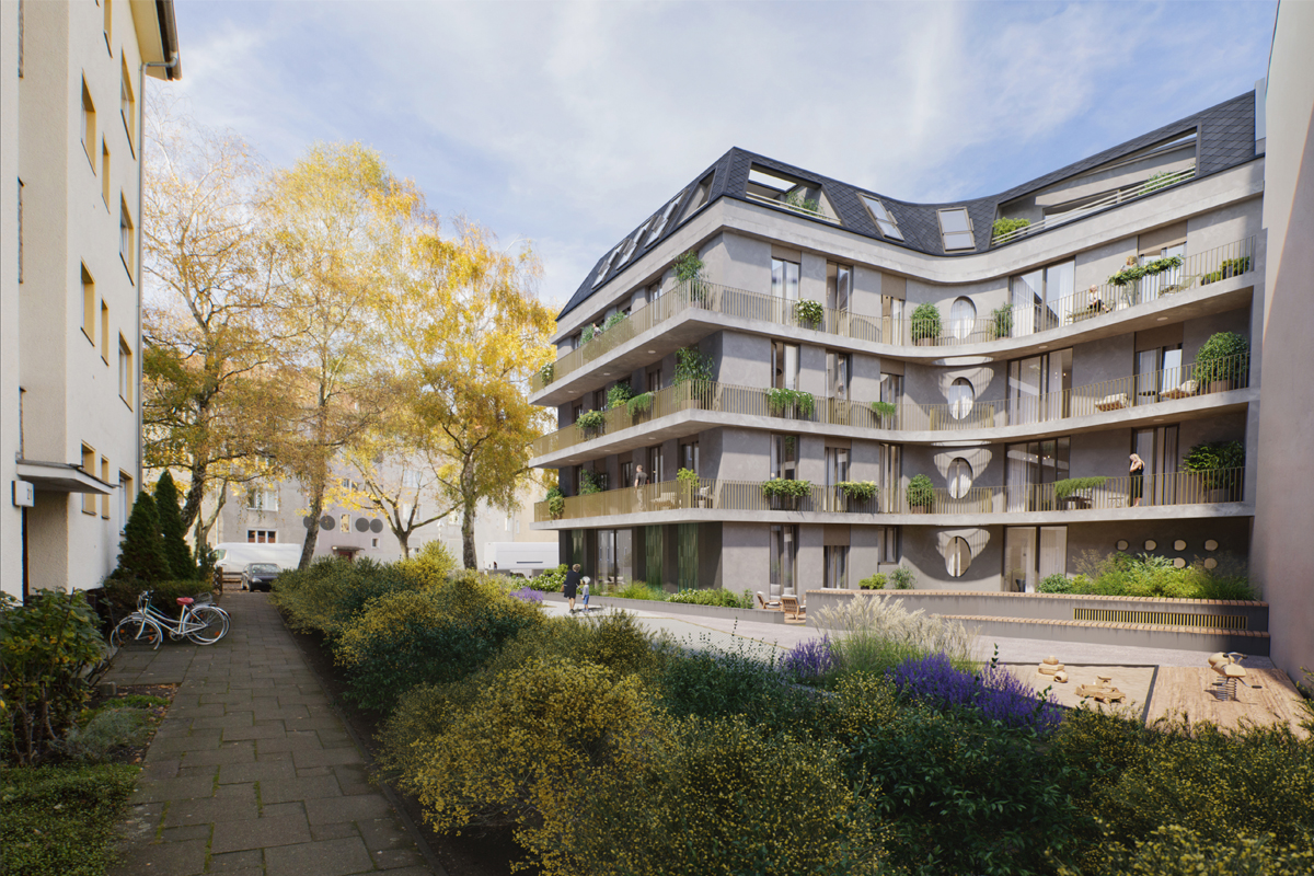 Gewählt haben wir in Anlehnung an die gegenüberliegende Bebauung eine geschwungene Fassade. Bodentiefe Fenster reihen sich in gleichmäßigem Rhythmus und werden von schlanken Gesimsbändern unterbrochen, die vor den Geschossdecken sitzen und gleichzeitig dem ruhigen Fassadenbild hohe Dynamik verleihen.