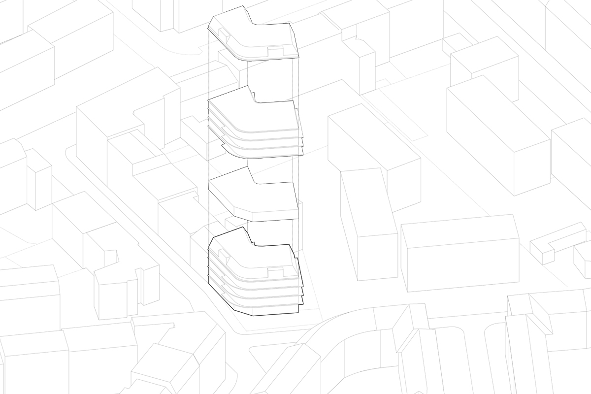 Den Sockel aus dunkel eingefärbtem Sichtbeton haben wir als Band ähnlich Papierscherenschnitten entwickelt. Die Fensterachsen der Regelgeschosse münden in Rundungen, die jeweils gegenläufig gespiegelt am Fuß des Hauses enden. Diese Abdrücke sind jeweils mit flaschengrüner Keramik ausgefachten.
