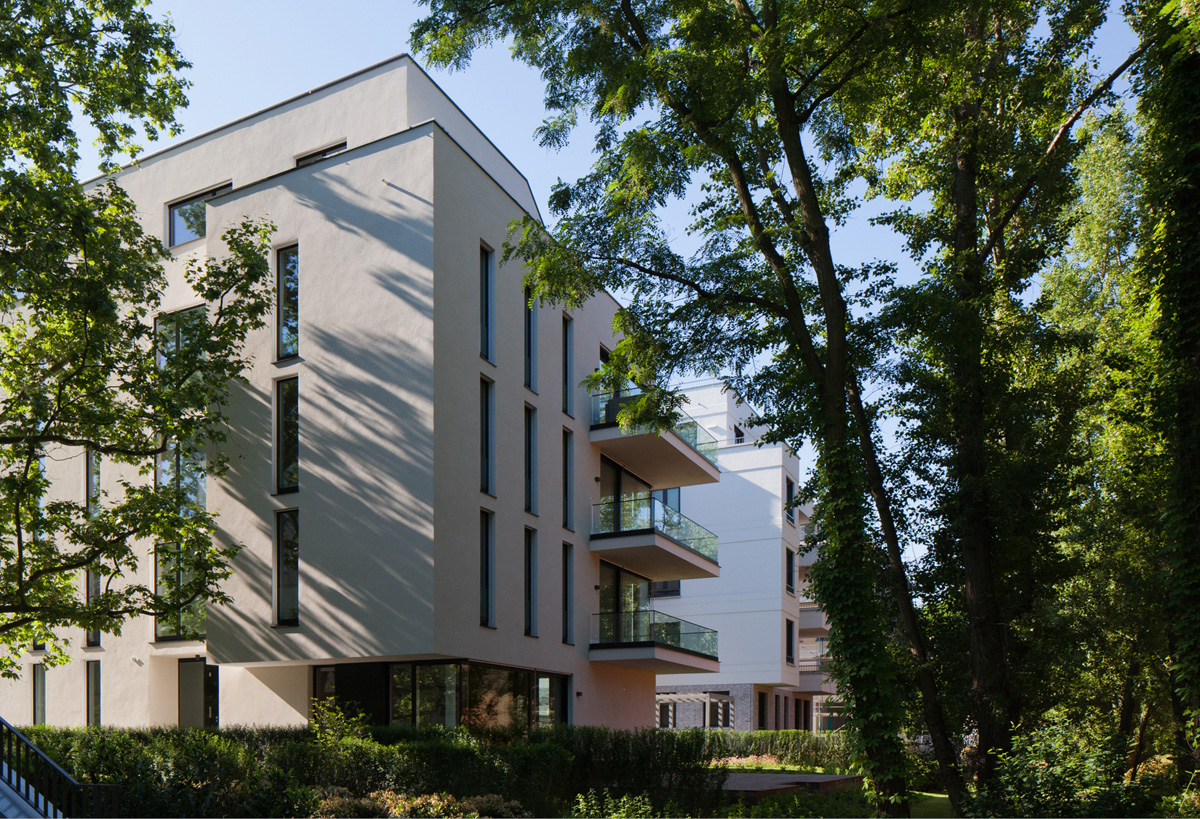 Das schlanke, längliche Baufeld in der Nummer 8 liegt auf der östlichen Seite der Clara-Wieck-Straße, und das Gebäude erlaubt unterschiedliche Blicke in die weitläufigen, parkähnlich angelegten Gärten.