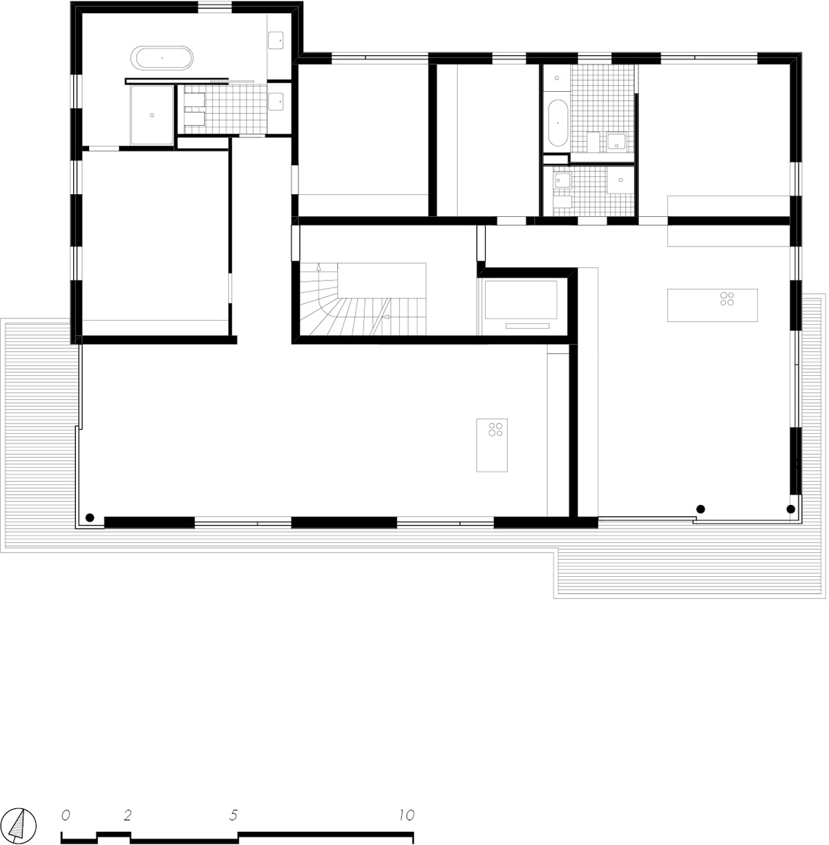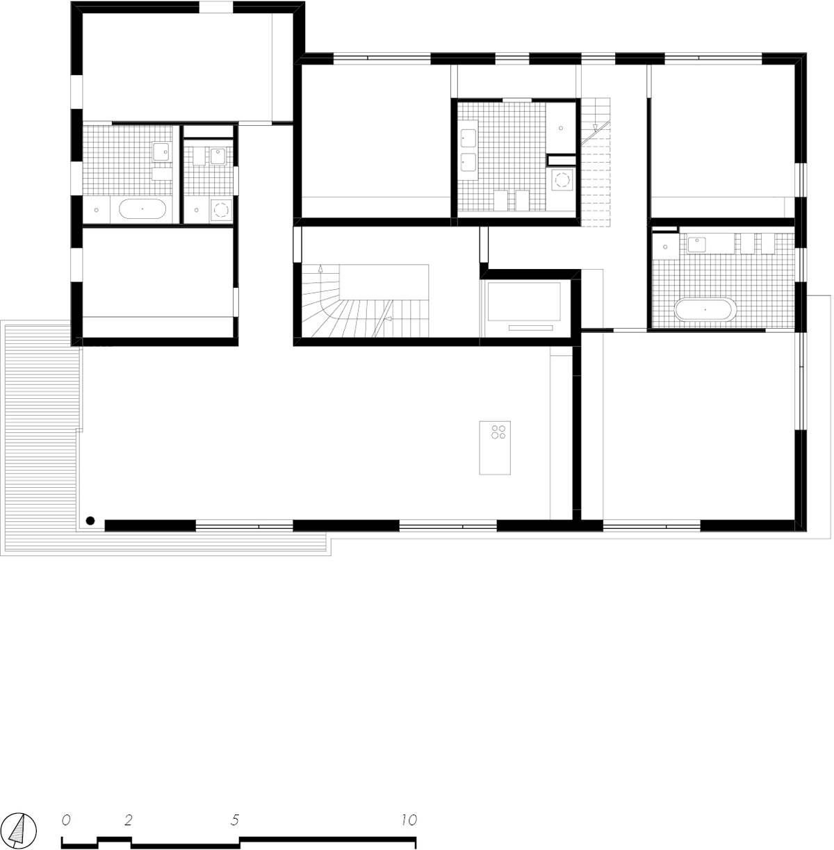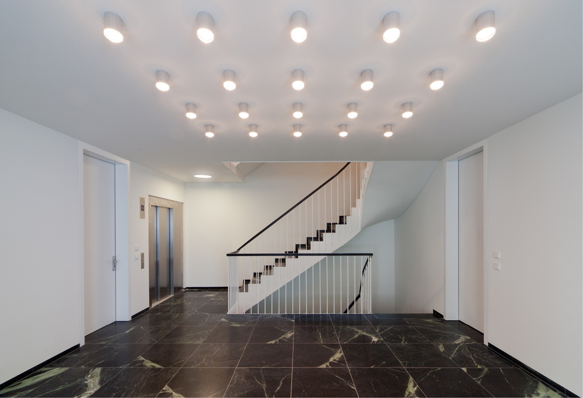 Das Treppenhaus bildet den Kern des Gebäudes, sodass in der Grundriss-Grundform mit einer Wohnung pro Geschoss eine räumlich luxuriöse Situation entsteht: Eine solche Wohnung erlaubt den Rundgang durch alle Zimmer mit Ausblick nach allen Himmelsrichtungen; hinzu kommen zwei Balkone mit Weitblick nach Südosten in Richtung Landwehrkanal und nach Westen in den privaten Garten. In den Normalgeschossen legen sich sechzig bis siebzig Quadratmeter große räumliche Einheiten ähnlich einer Windmühle um den Treppenhauskern; die nach Süden orientierten offenen Räume bilden die öffentlichen Bereiche zum Kochen, Essen und Leben, während die nach Norden orientierten privaten Räume feiner gegliedert werden.