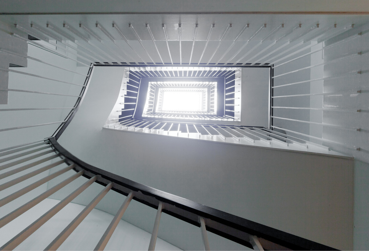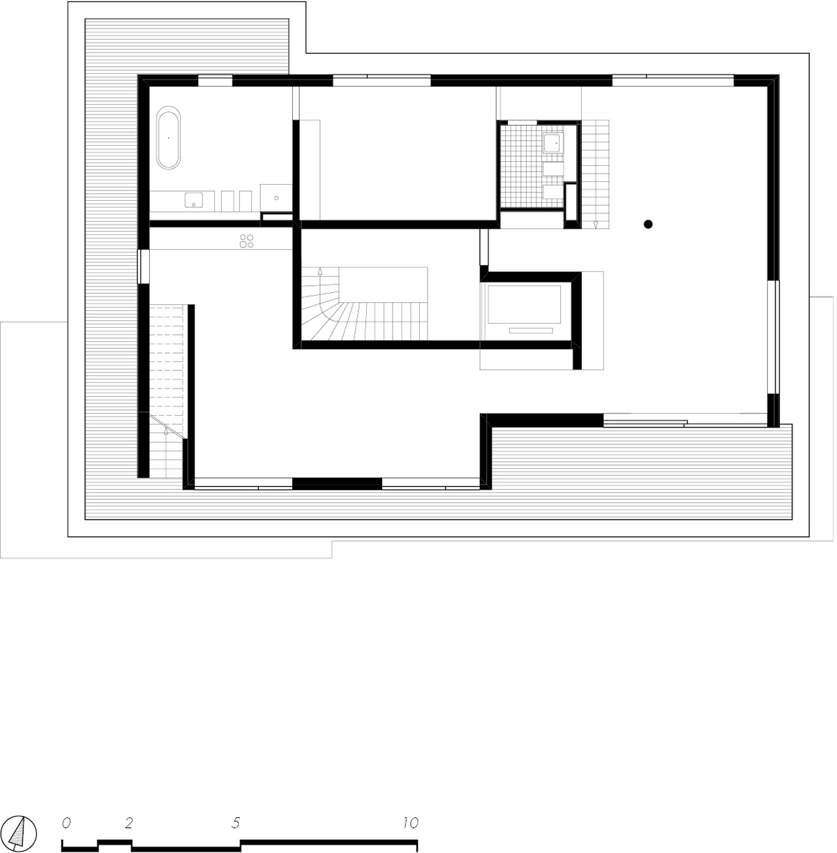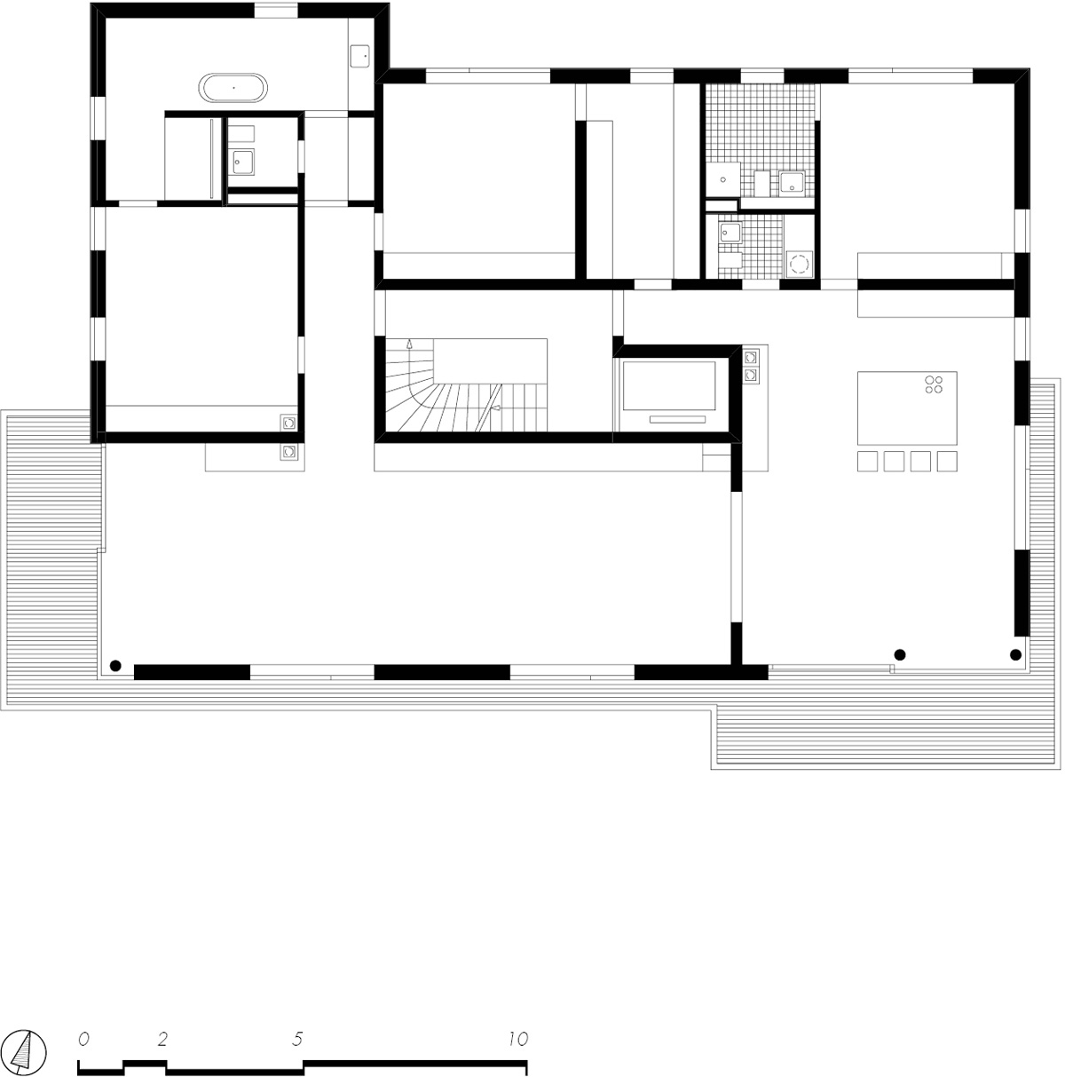 Das Treppenhaus bildet den Kern des Gebäudes, sodass in der Grundriss-Grundform mit einer Wohnung pro Geschoss eine räumlich luxuriöse Situation entsteht: Eine solche Wohnung erlaubt den Rundgang durch alle Zimmer mit Ausblick nach allen Himmelsrichtungen; hinzu kommen zwei Balkone mit Weitblick nach Südosten in Richtung Landwehrkanal und nach Westen in den privaten Garten. In den Normalgeschossen legen sich sechzig bis siebzig Quadratmeter große räumliche Einheiten ähnlich einer Windmühle um den Treppenhauskern; die nach Süden orientierten offenen Räume bilden die öffentlichen Bereiche zum Kochen, Essen und Leben, während die nach Norden orientierten privaten Räume feiner gegliedert werden.