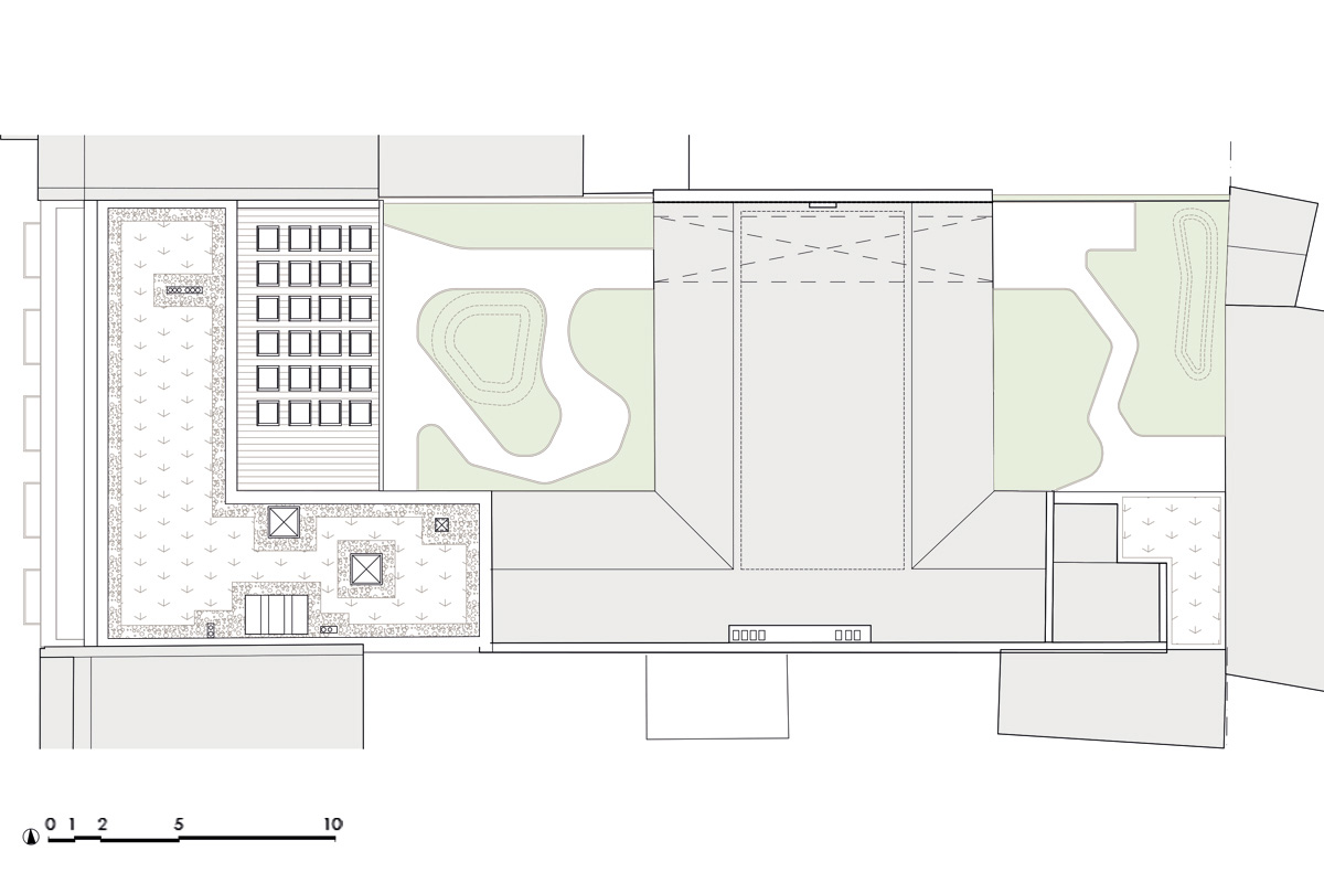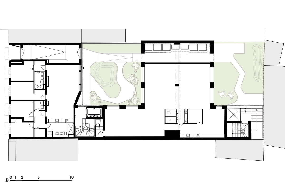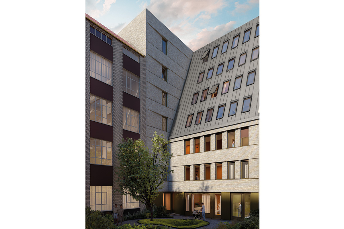 Städtebaulich im Fokus ist die Erstellung von Wohnungen mit Weitblick in den Park, die Neugestaltung einer Hof-Oase – die Gewerbeflächen im Hof verbleiben mit Weitblick in die Hoflandschaft zur Kirche.
