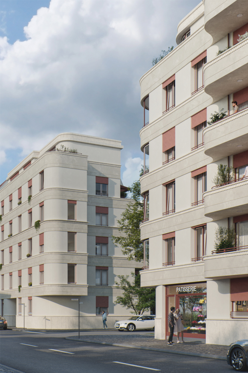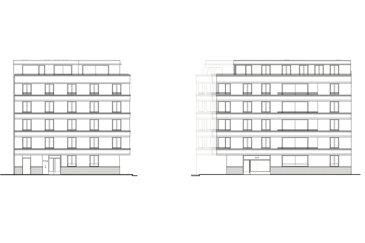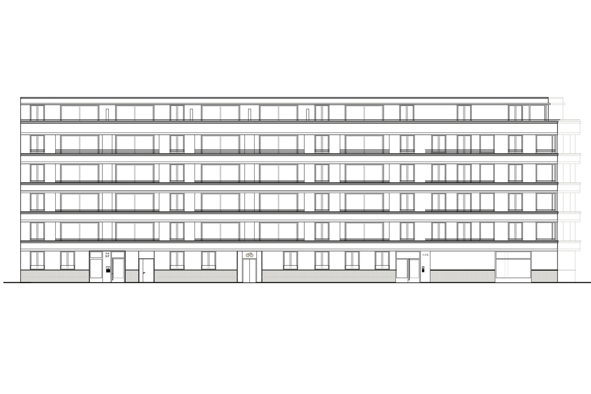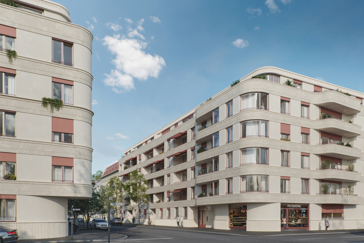 Die Häuser sind klassisch gegliedert mit hohem Erdgeschosssockel, gleichmäßig ausgebildeten Regelgeschossen und einem rückspringenden Staffelgeschoss.