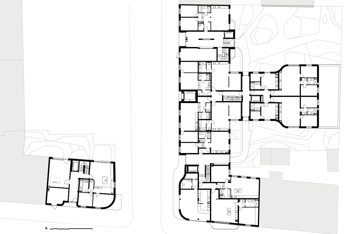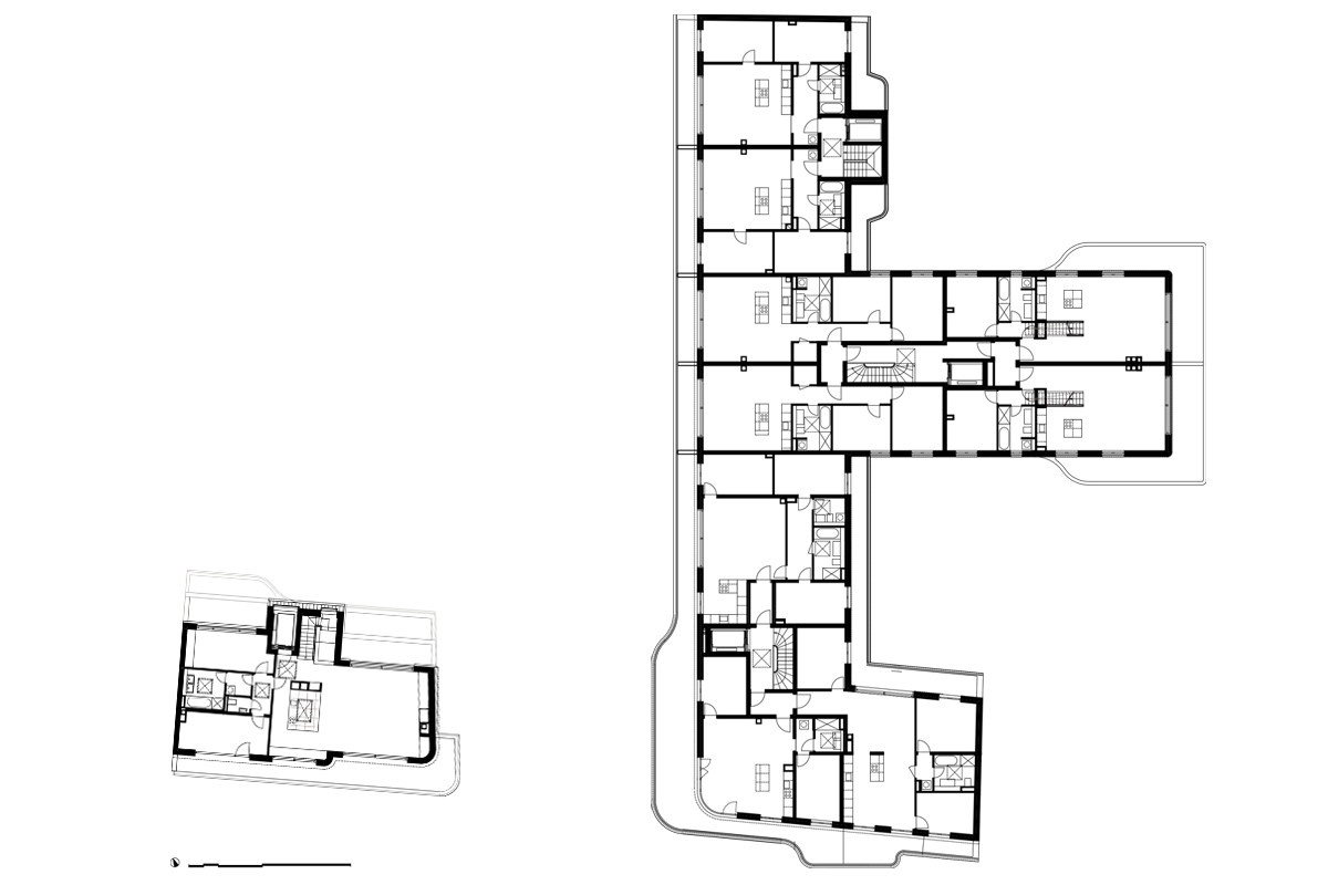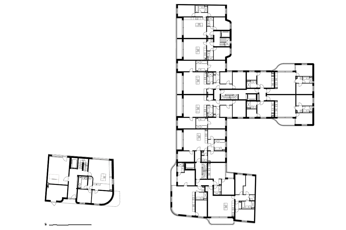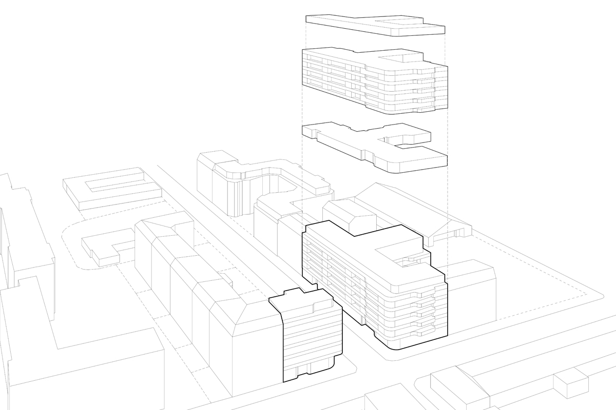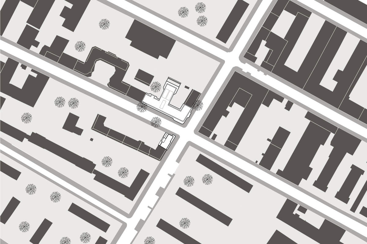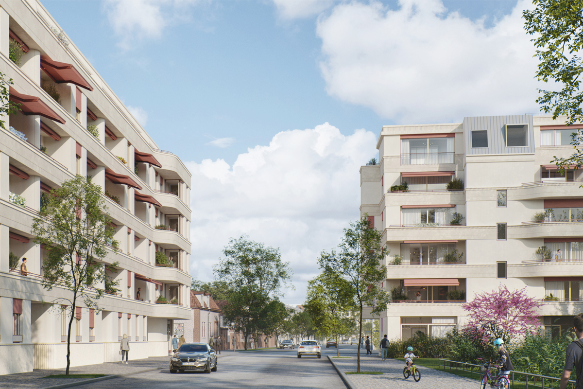 Unser Entwurf für die beiden Neubauten interpretiert die morphologischen Bausteine der näheren Umgebung; hier konkret ist unsere städtebauliche Idee die Umsetzung von zwei Kopfgebäuden als Tor zur Lehderstraße. Die beiden gegenüberliegenden Fassaden werden mit zur Lehderstraße geringfügig auskragenden und leicht geschwungenen Ecken errichtet, die den Betrachter in die Lehderstraße in Richtung Weißenseer Spitze hineinführen.