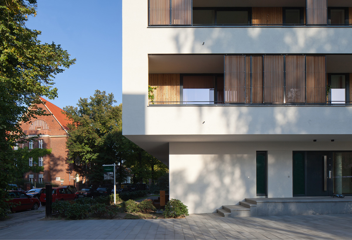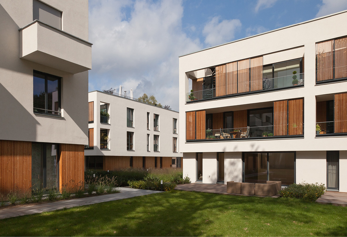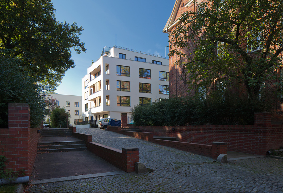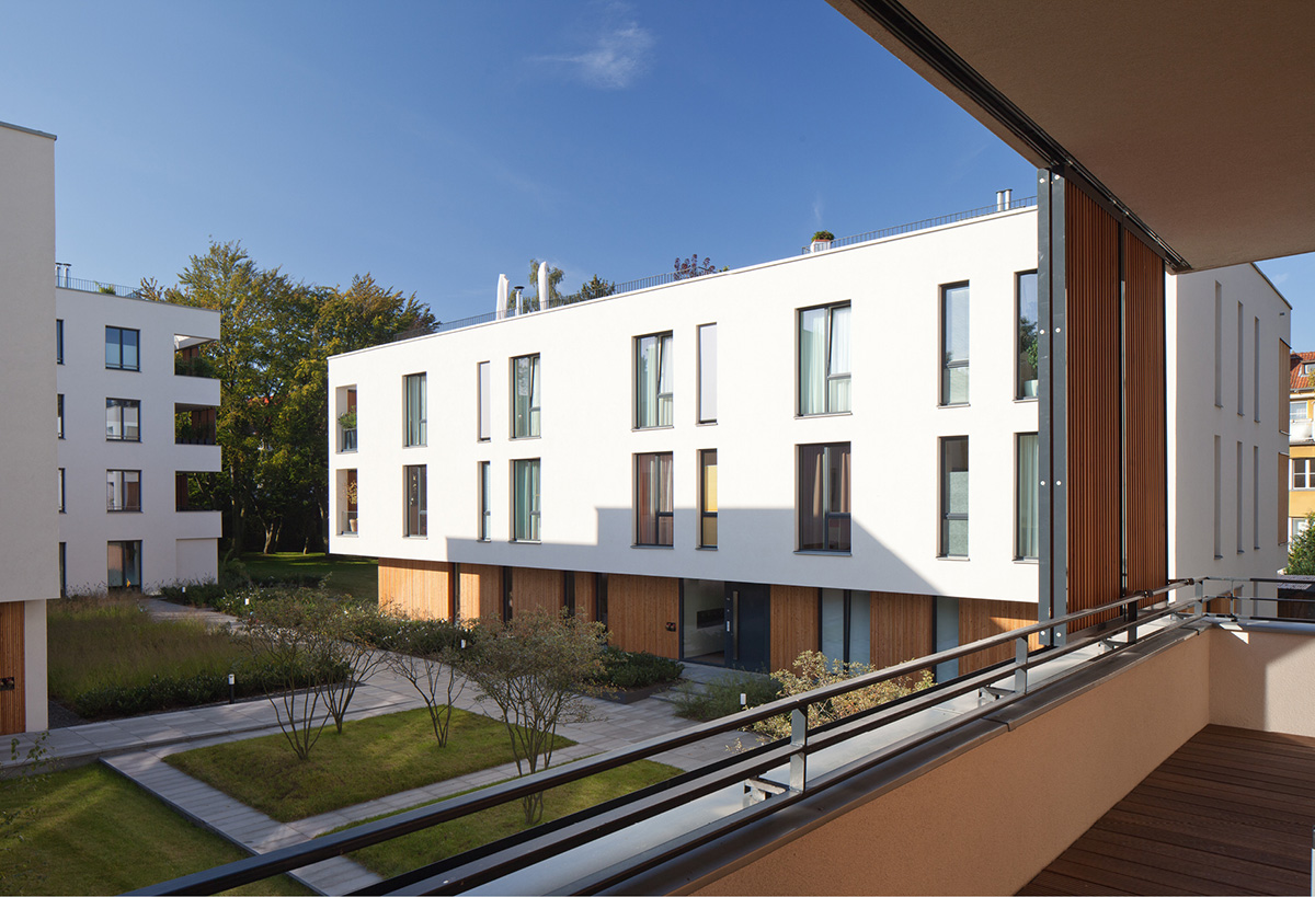 Die vier Häuser sind so platziert, dass jedes Haus an seinen langen Seiten weite Blicke in den grünen Hofbereich oder zur Straße freigegeben werden. In ihrer Höhenentwicklung reagieren die Häuser auf den Bestand der näheren Umgebung.