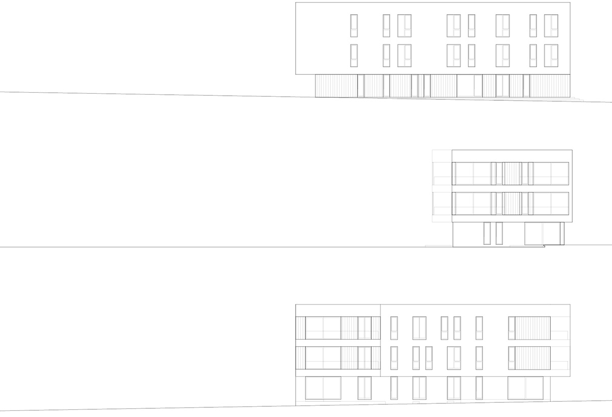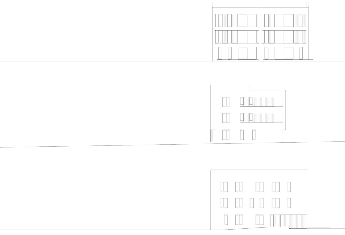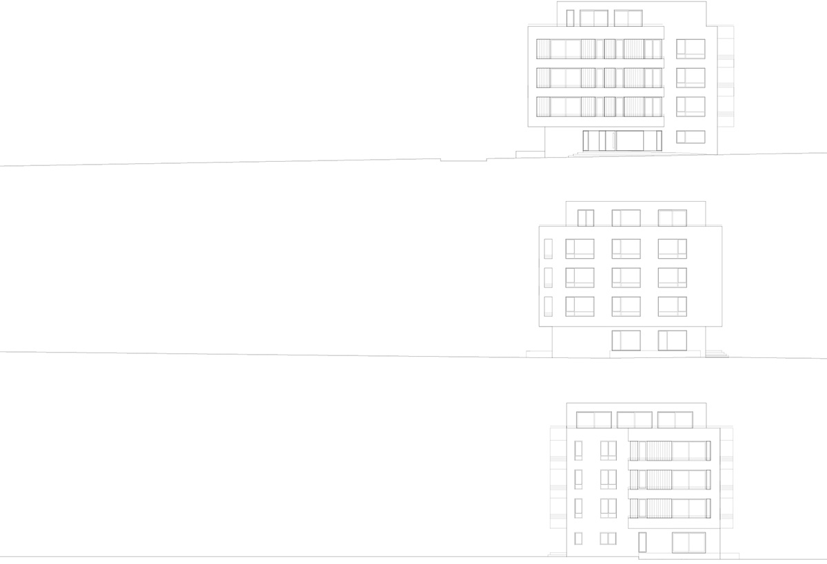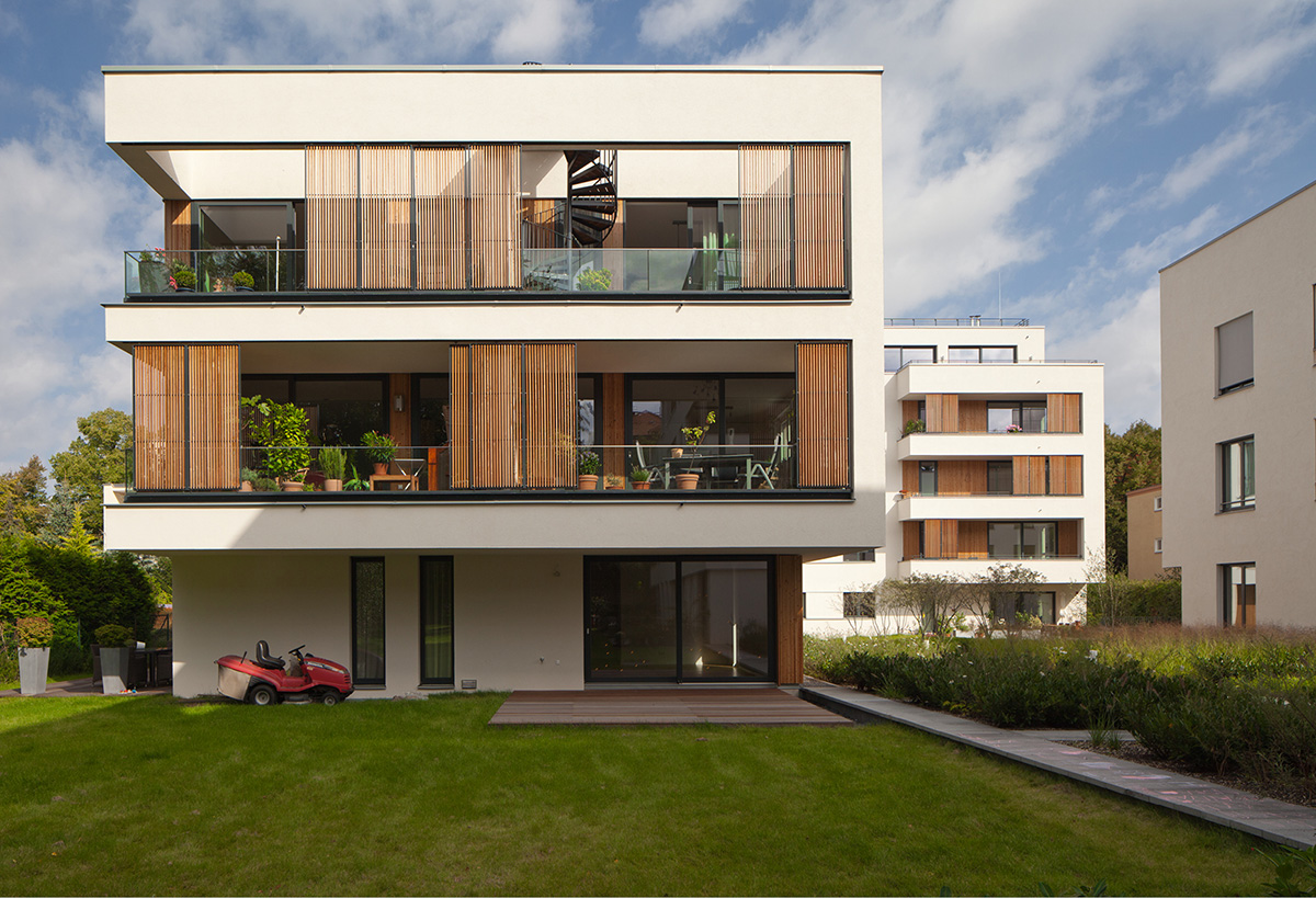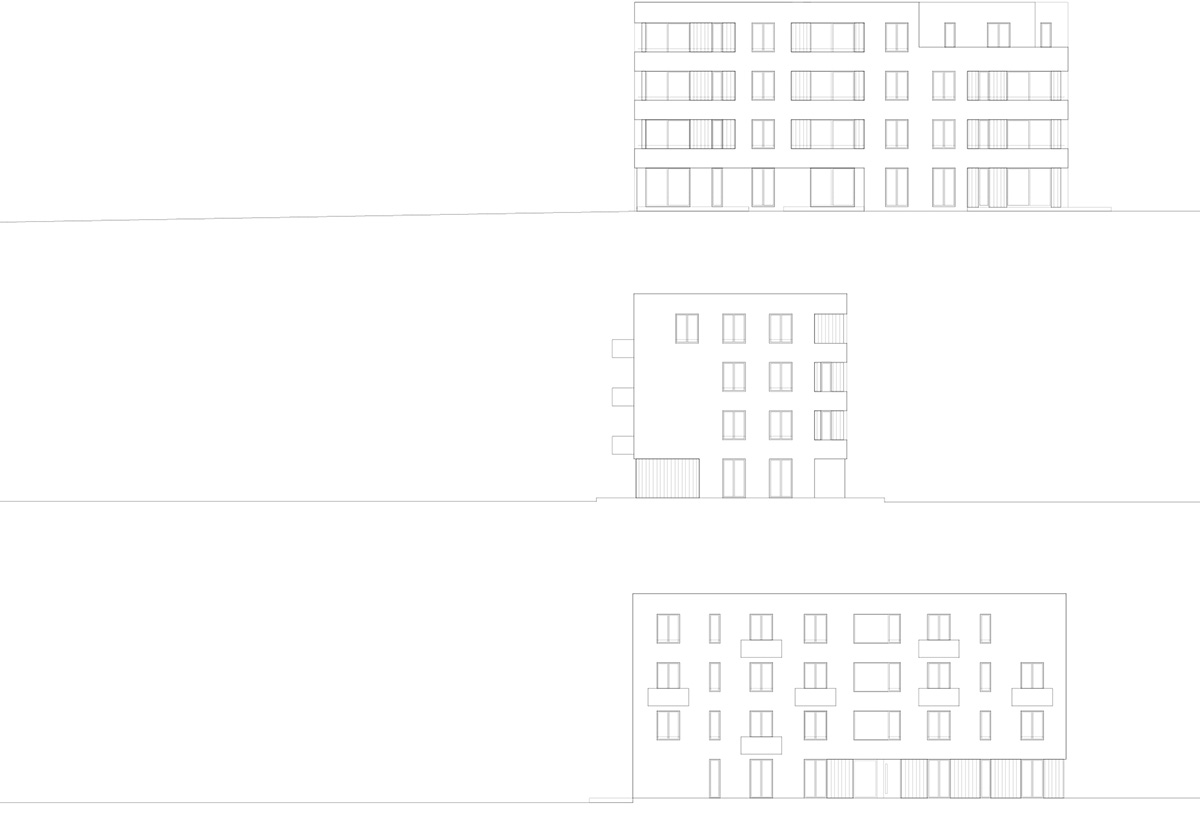 Die vier Häuser sind so platziert, dass jedes Haus an seinen langen Seiten weite Blicke in den grünen Hofbereich oder zur Straße freigegeben werden. In ihrer Höhenentwicklung reagieren die Häuser auf den Bestand der näheren Umgebung.