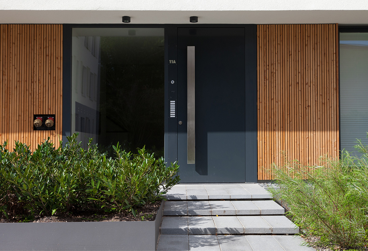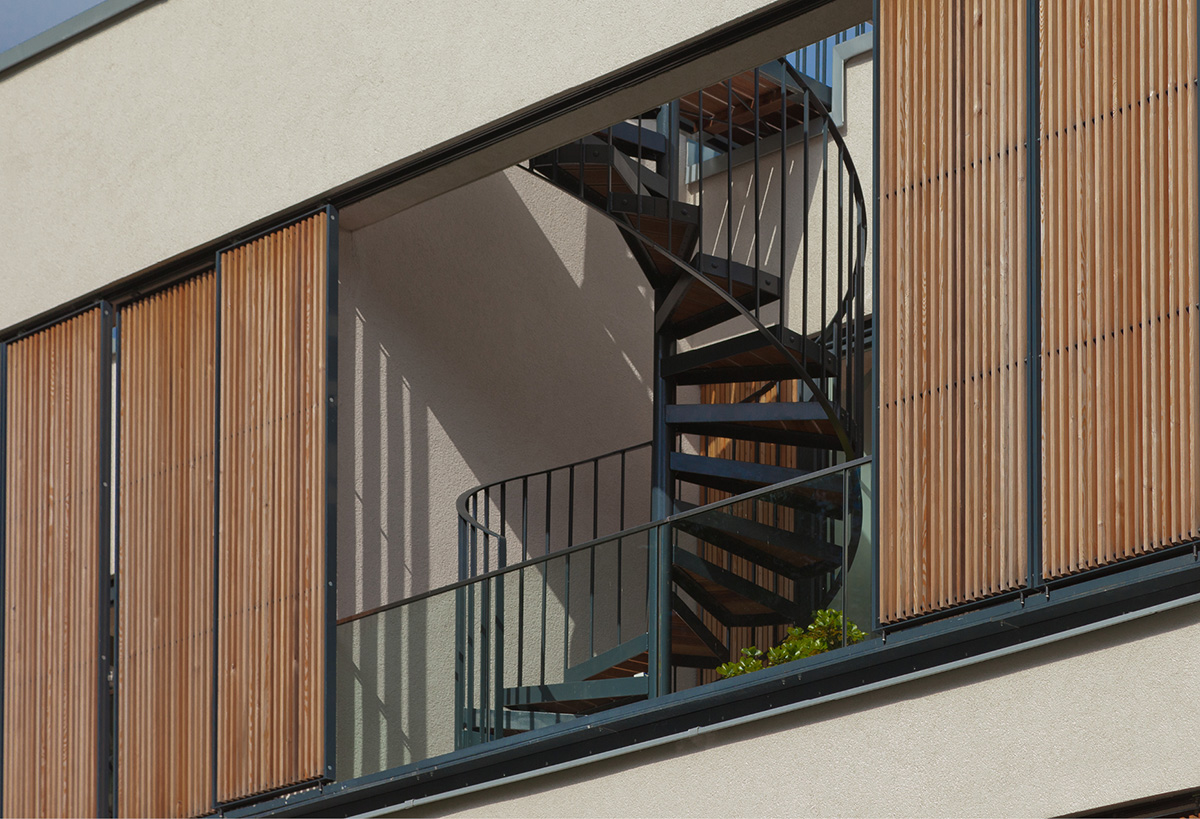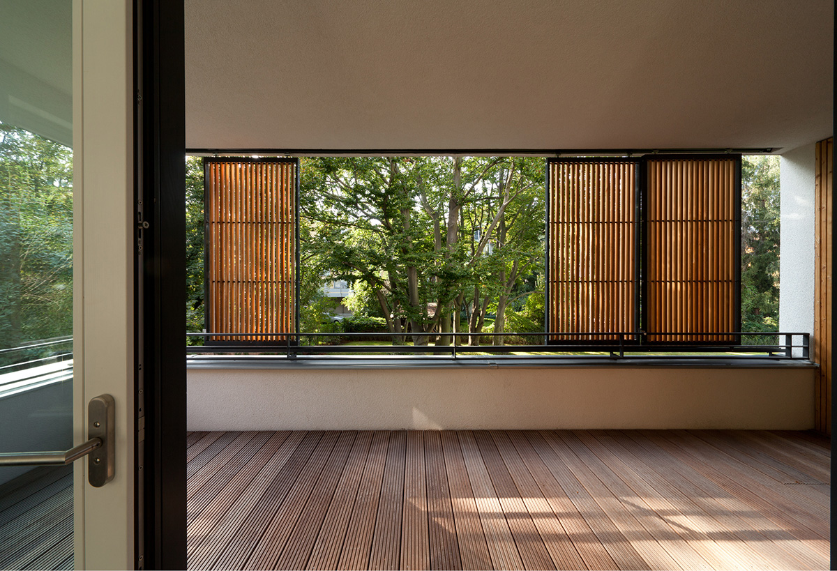 Bei den Materialien im Außenraum prägen die lichten, sandigen Farben des Putzes im Wechselspiel mit warmen Farbtönen der Fassadenbereiche aus Holz die Atmosphäre. Die Außenwände werden von großen Fenstern durchbrochen, sodass die Wohnräume sich mit den Gärten und Außenräumen verknüpfen.