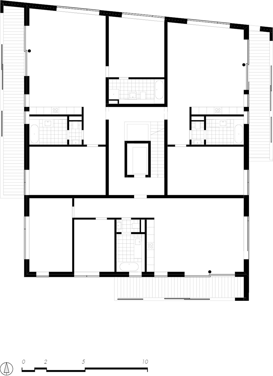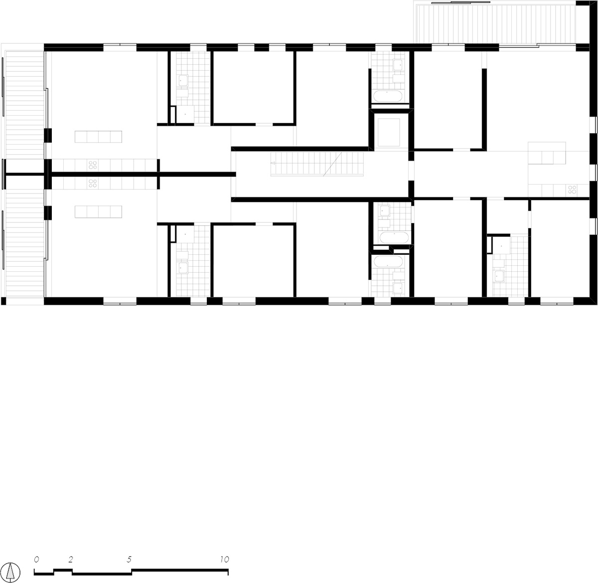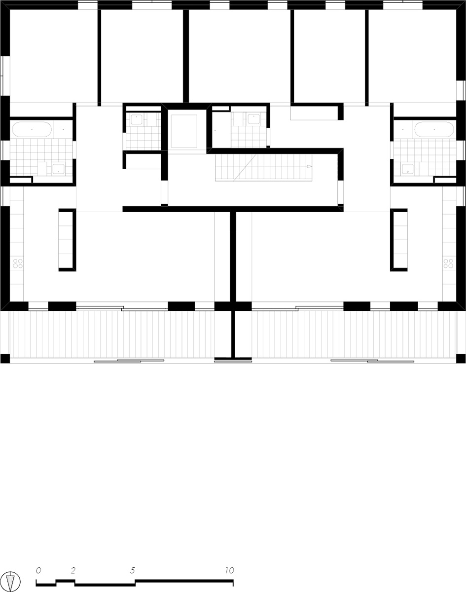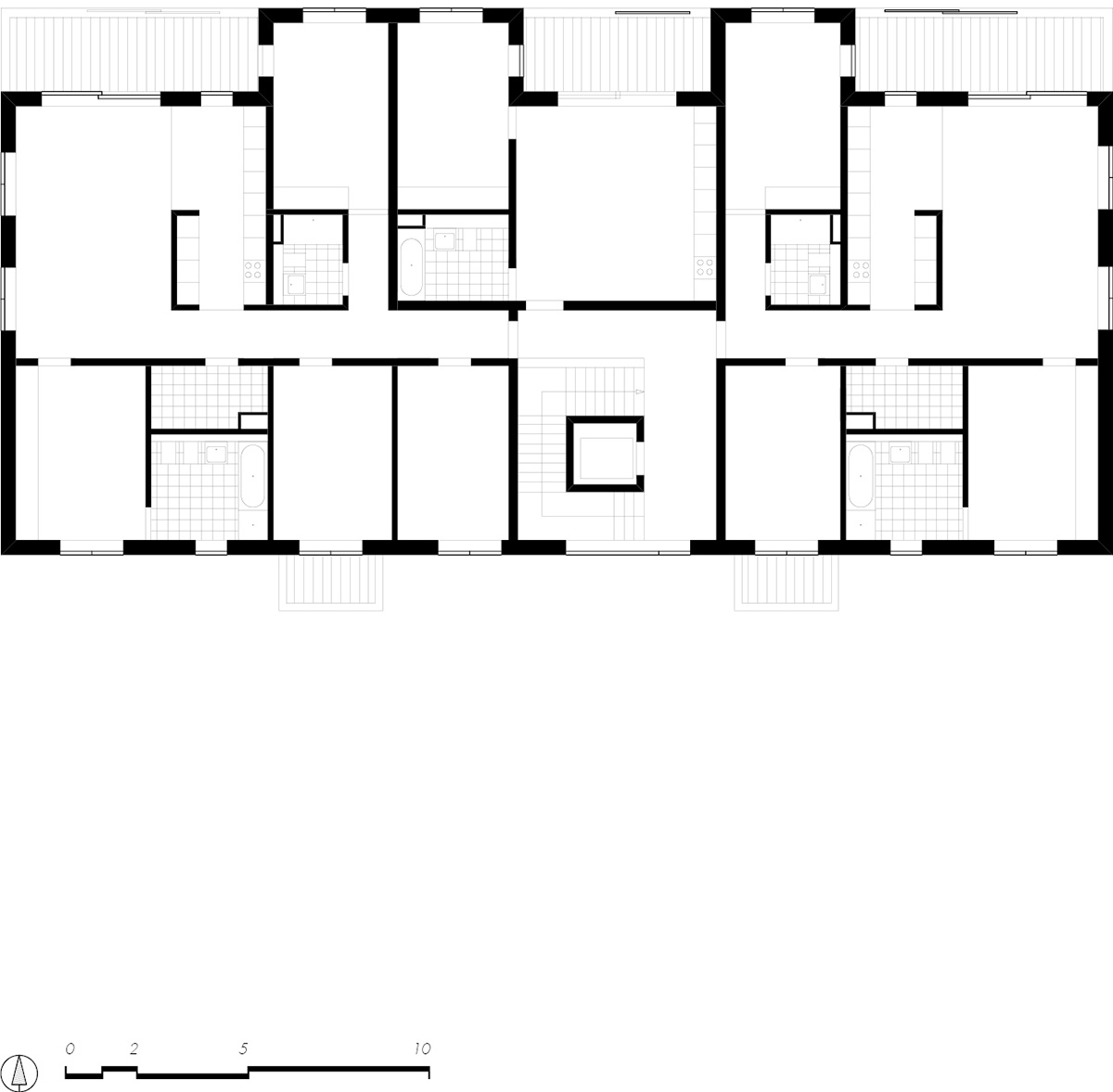 Die Häuser bieten offene, zeitgenössische Wohnformen. Den Wohnungstypen gemeinsam sind große gemeinschaftliche Bereiche zum Kochen, Essen und Leben, die das Zentrum der Wohnung bilden, und davon getrennt kleinere, gleichwertige Räume als Privatflächen zum Arbeiten, Schlafen oder für Gäste. Die lichte Raumhöhe von drei Metern korrespondiert mit den großzügig entwickelten Grundrissen.