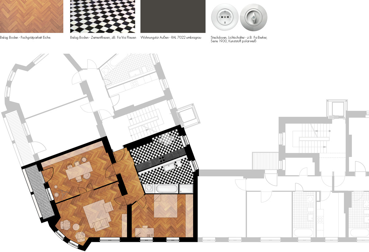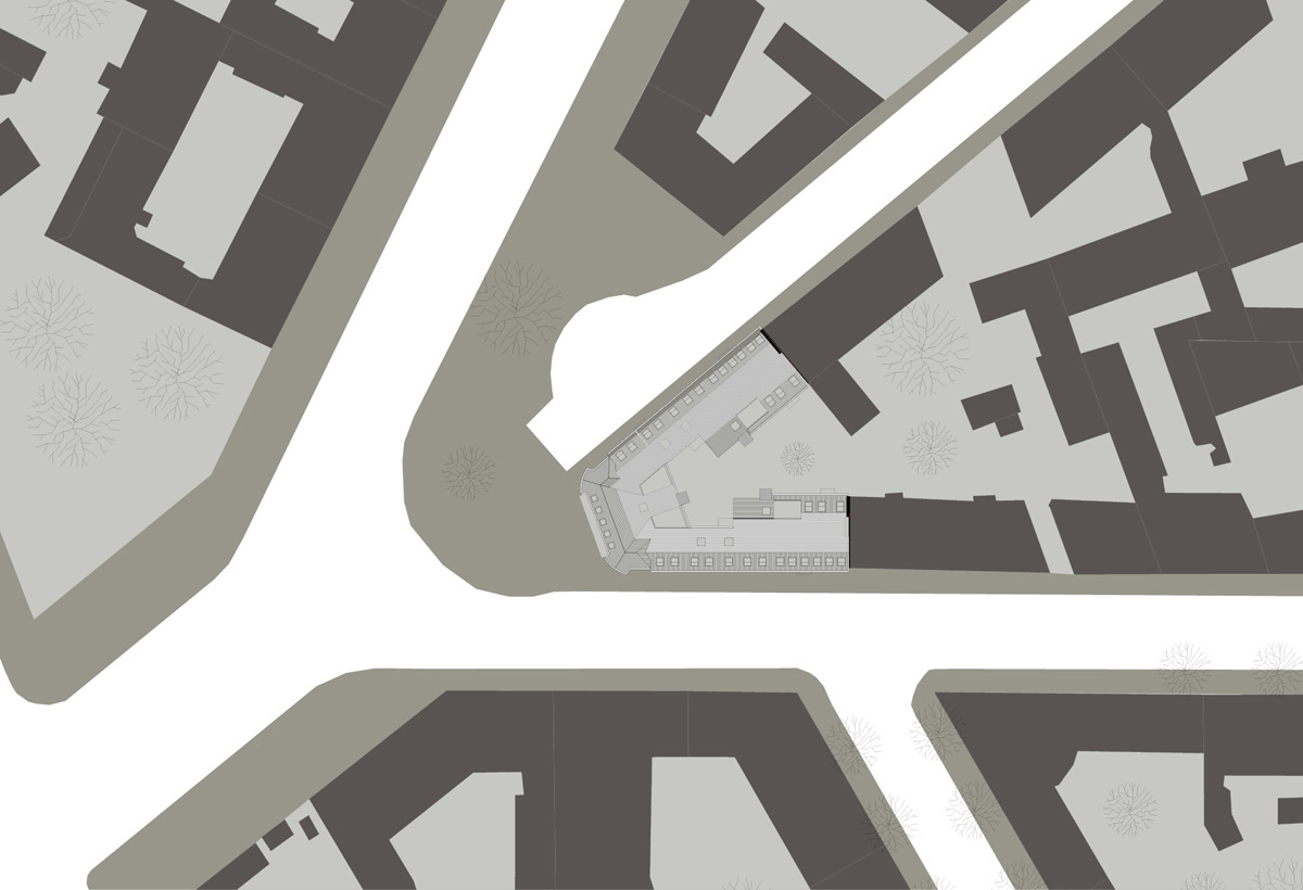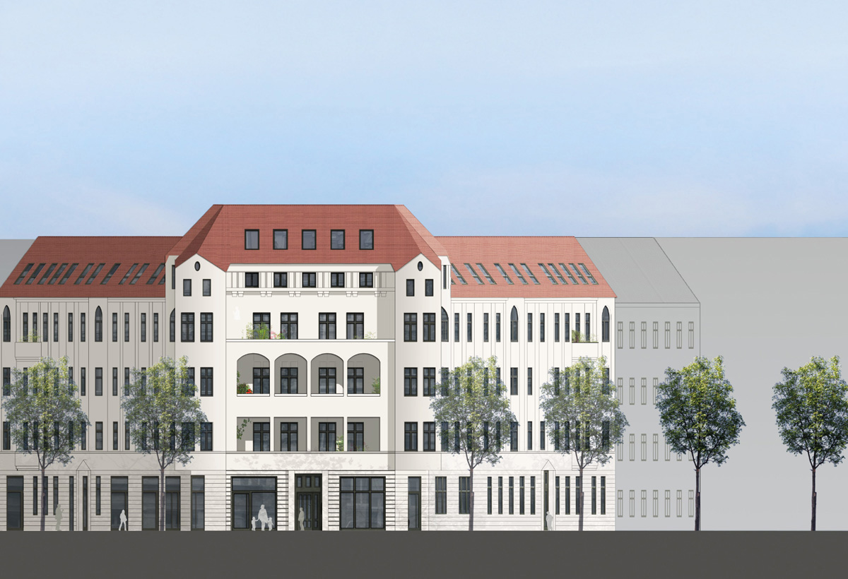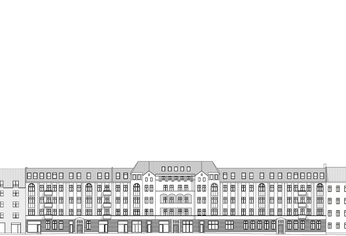 Das Haus wird von Grund auf modernisiert. Der Dachstuhl wird neu errichtet und Balkone Aufzüge im Hof errichtet. Die Straßenfassade im Bestand zeigt, dass das Stadthaus in seiner architektonischen Gestaltung die städtebaulichen Anforderungen am weiträumigen Caligariplatz schlüssig umsetzt.