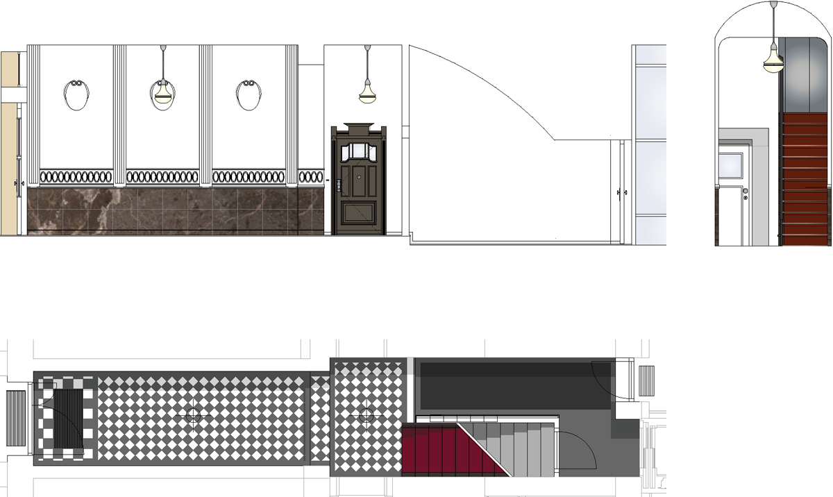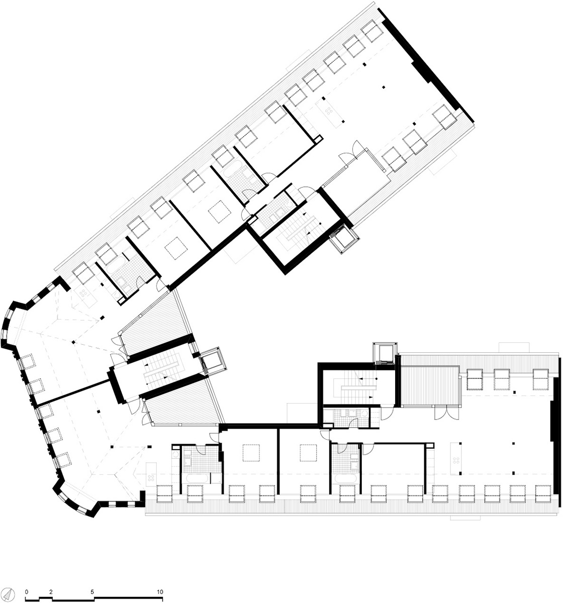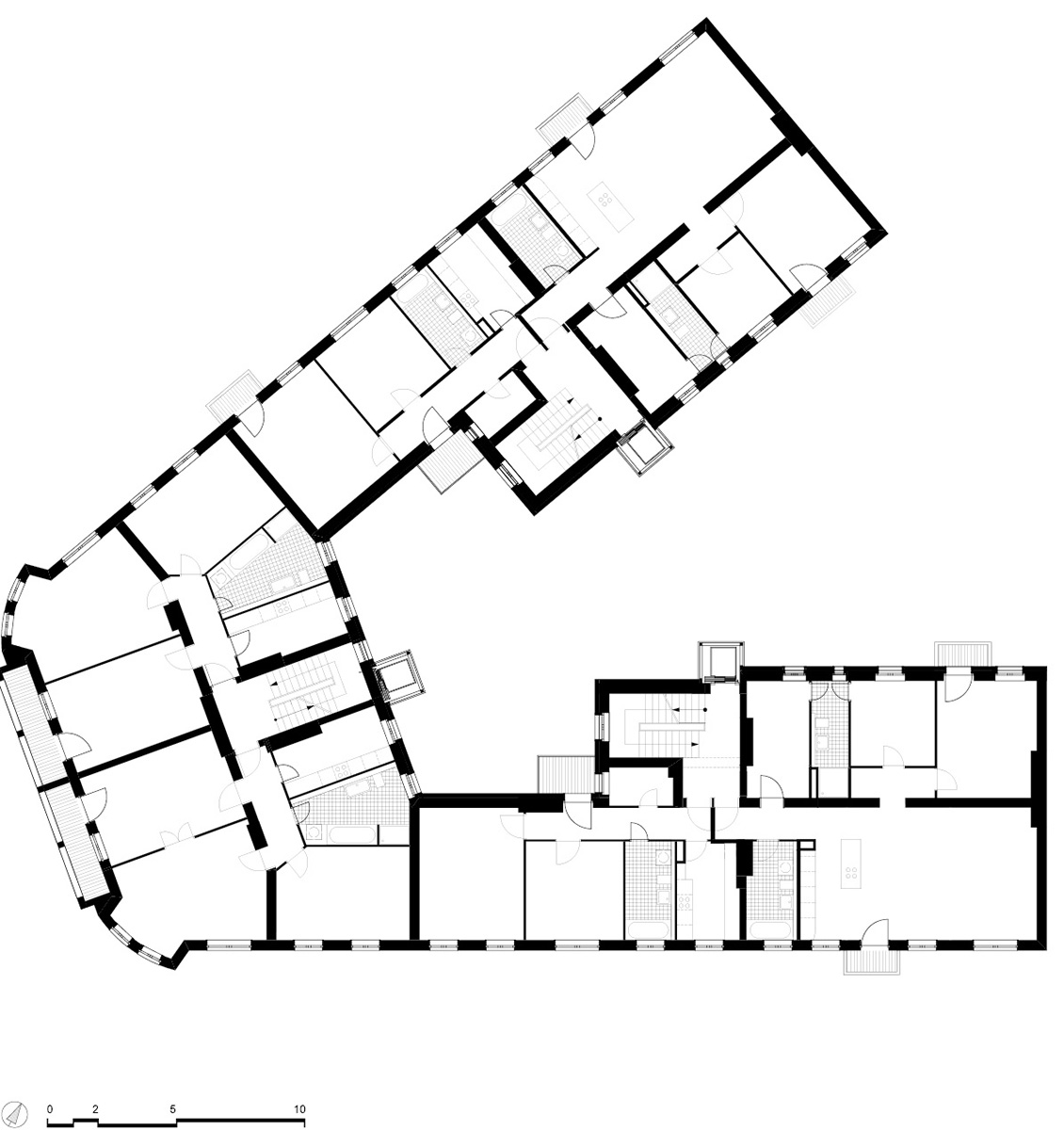 Das Haus wird von Grund auf modernisiert. Der Dachstuhl wird neu errichtet und Balkone Aufzüge im Hof errichtet. Die Straßenfassade im Bestand zeigt, dass das Stadthaus in seiner architektonischen Gestaltung die städtebaulichen Anforderungen am weiträumigen Caligariplatz schlüssig umsetzt.