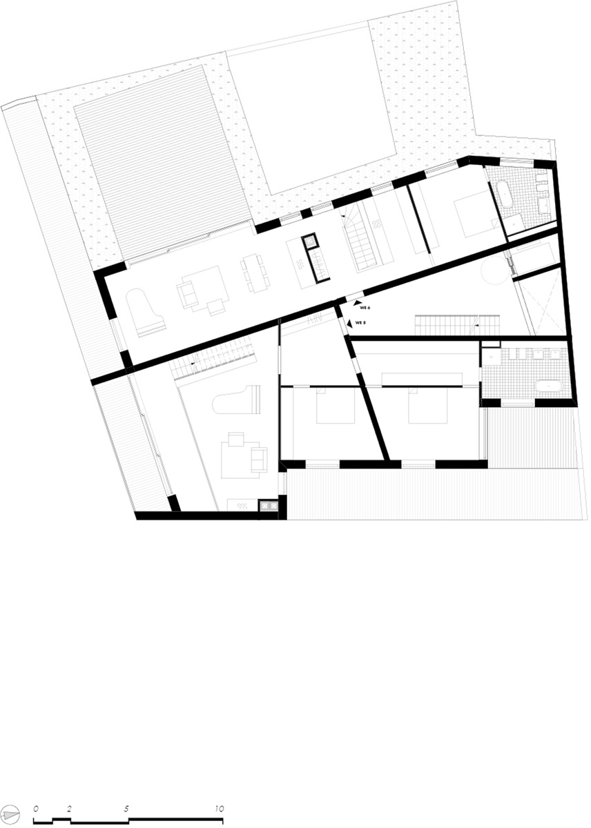 Die Materialität der Fassade wurde konzipiert als helle, fast porzellanartige Steinfassade. Die mehrschichtig gegliederte Wandkonstruktion wurde aus vorgemauerten, großteiligen Fassadensteinen aus gestocktem Weißzementbeton geplant. Die Fenster wurden im Kontrast in tiefschwarzem Aluminium mit verchromten Glasklemmleisten entworfen. Die gestockte Fassade übernimmt dabei klassische Handwerkstraditionen und moderne Steinkonstruktionen und formuliert gemeinsam mit den Aluminium-Chromfenstern den eleganten und klassischen Anspruch des Entwurfs, der in der Detailwahrnehmung mit den gewählten Oberflächen haptisch wahrgenommen wird.