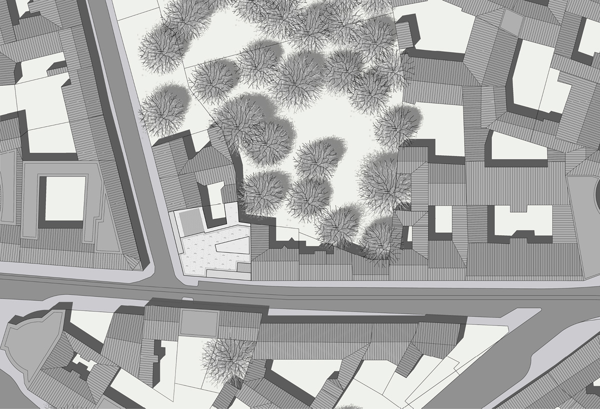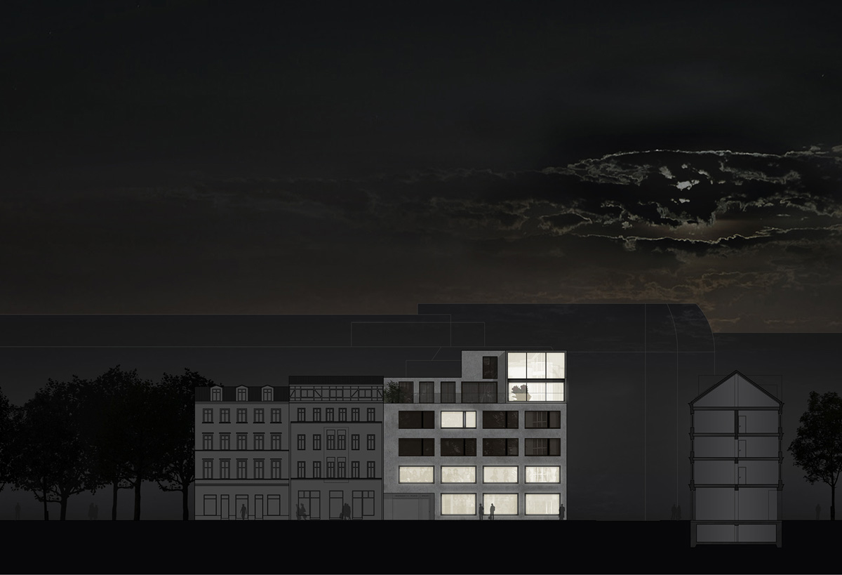 Unser Beitrag erhielt im Wettbewerb den 1. Preis und sucht eine in Maßstab und Materialität zeitgenössische Übersetzung großstädtischer Architektur, die den ausgelobten verschiedenen Nutzungsansprüchen Rechnung tragen, ohne in Einzelteile zur zerfallen.