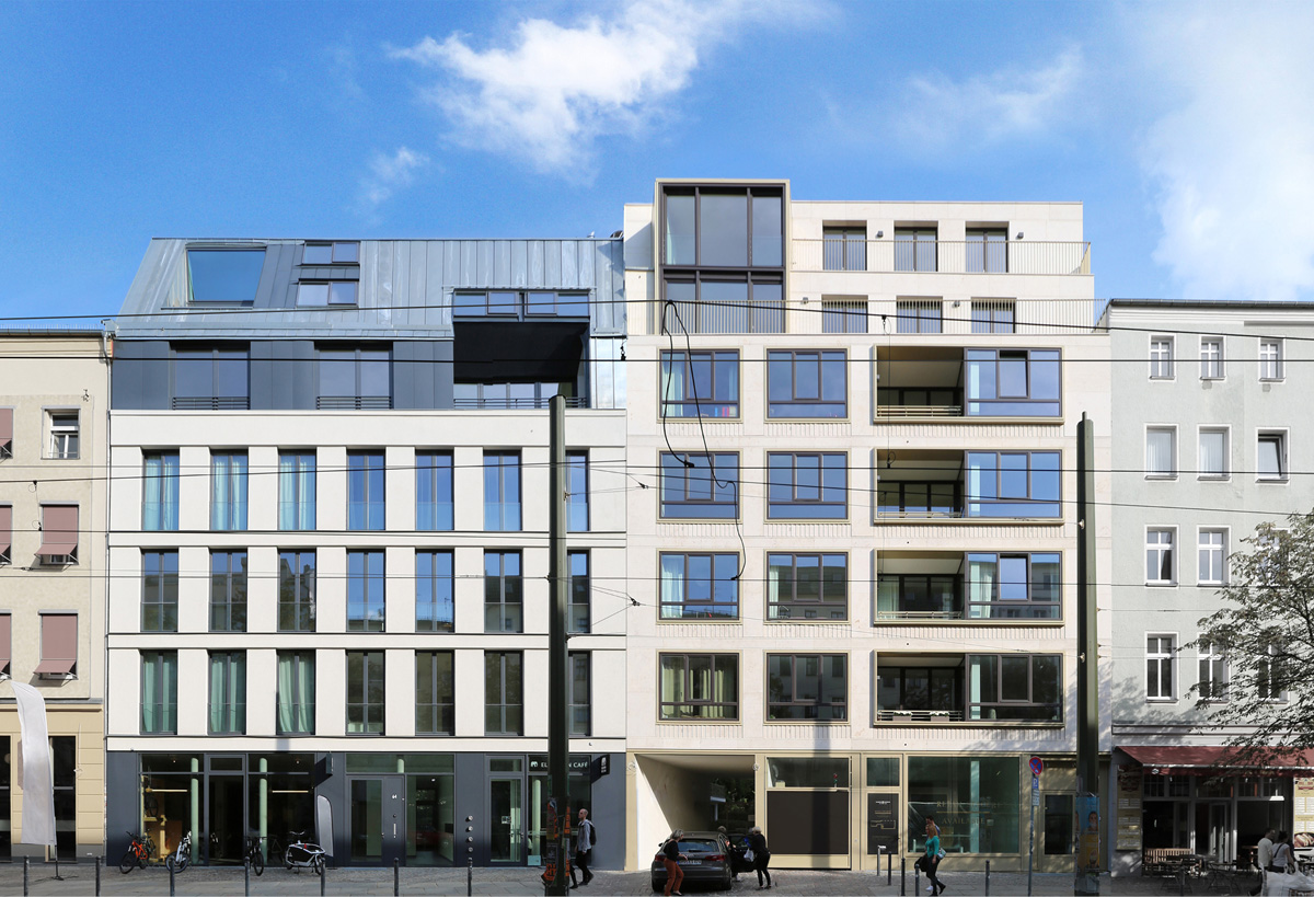 Kernidee des Entwurfs in der Kastanienallee 63 war eine zeitgenössische Interpretation des Typus des klassischen Berliner Mietshauses. An die Stelle der kleinteilig gegliederten Fassade der Berliner Gründerzeitbauten haben wir extra große Fenster gesetzt, die als Schaukästen aus der Fassade heraus in den Straßenraum treten und von innen den Blick in die belebte Kiezstraße rahmen. In ihrer Anordnung deuten die Fenster einerseits klassische Proportionen von Sockel, Hauptgeschoss und Attika an und bilden andererseits die großzügigen Wohnräume der Stadtwohnungen ab.