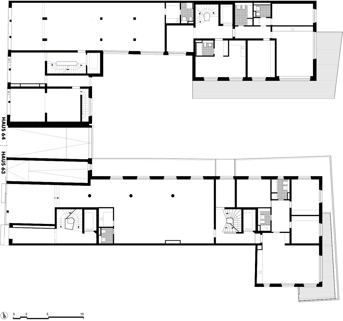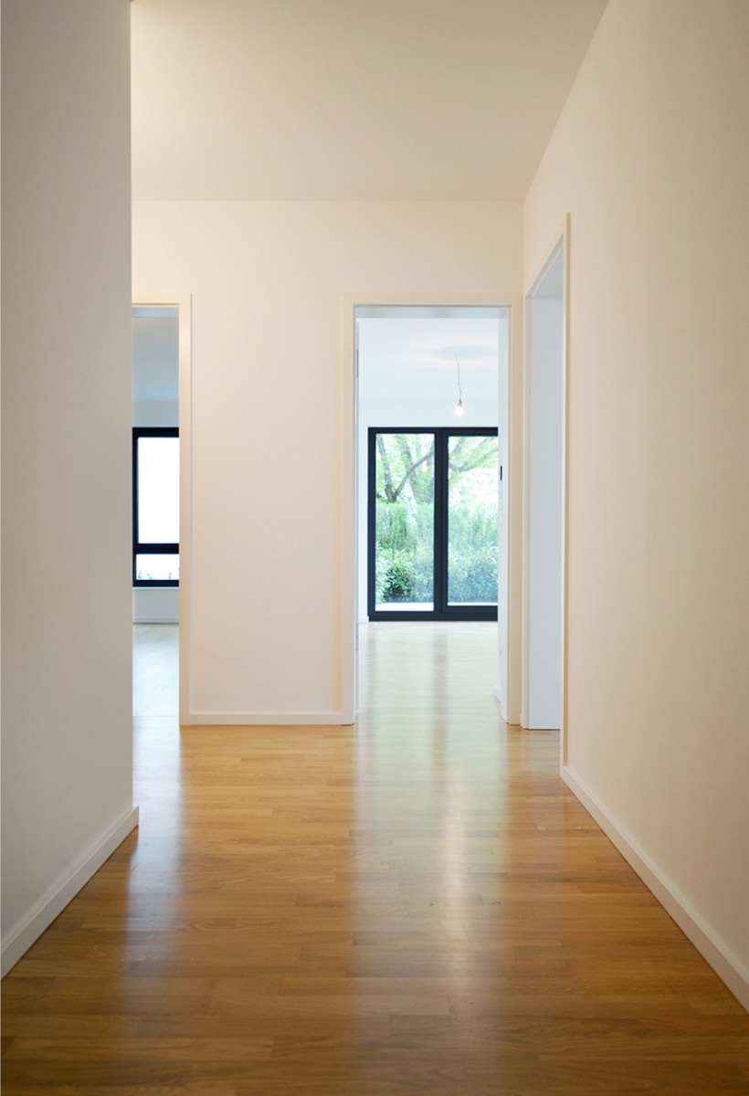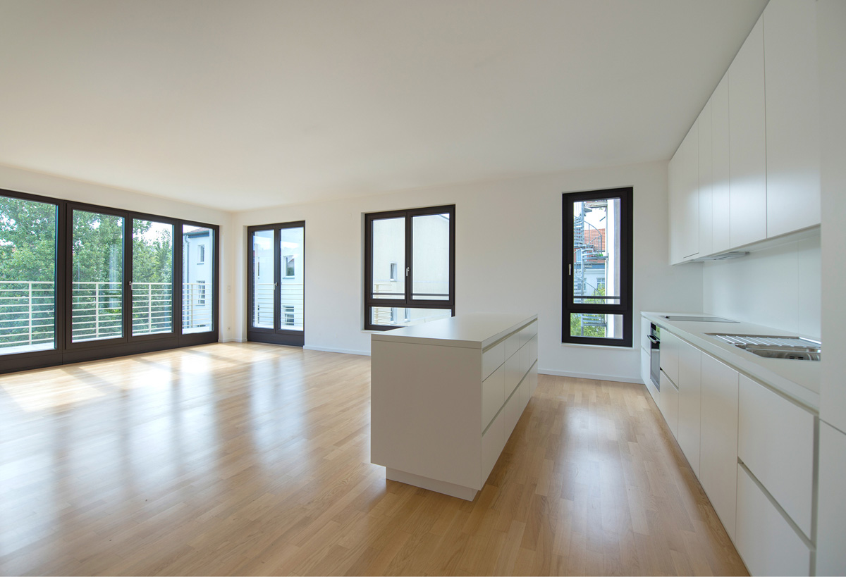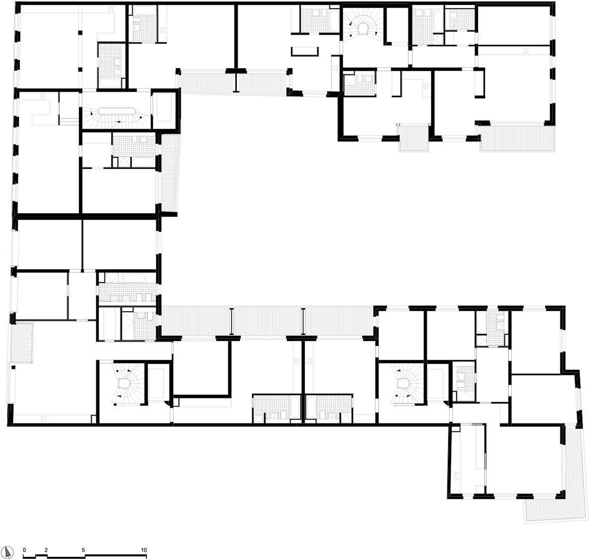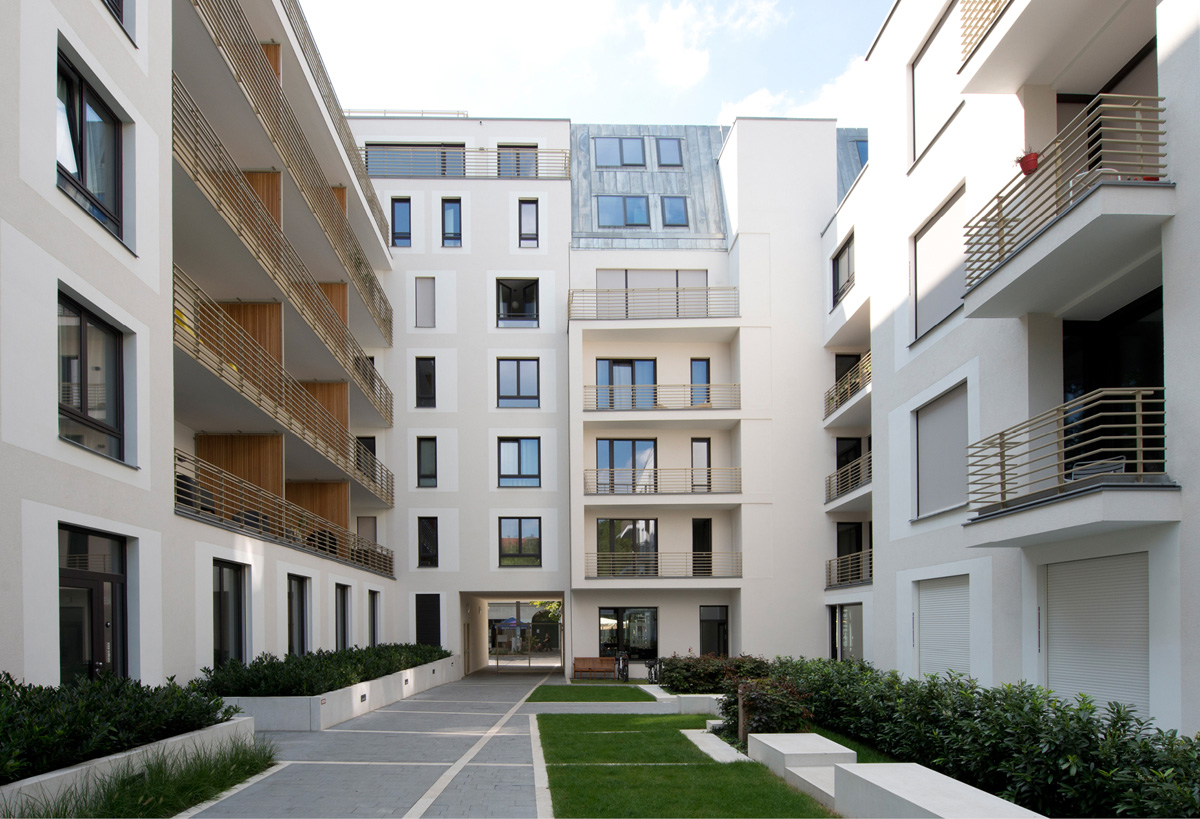 Die Aufteilung innerhalb der Wohnungen interpretieren die räumlichen Qualitäten der Berliner Gründerzeit und bieten so Gestaltungsraum für jeden individuellen Bewohner. Auf den rückwärtigen Seiten schaffen großzügige Balkone und Terrassen für jede Wohnung räumliche und visuelle Bezüge zum weitläufigen Garten im Hof.