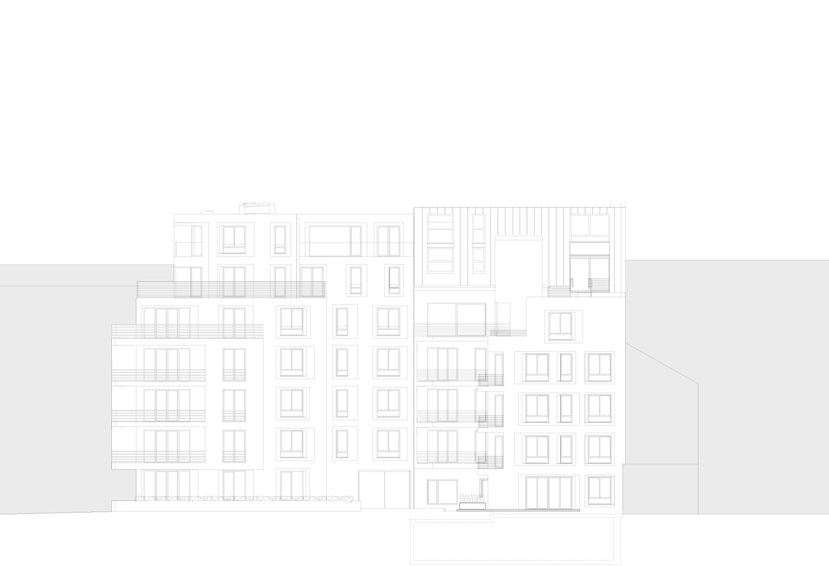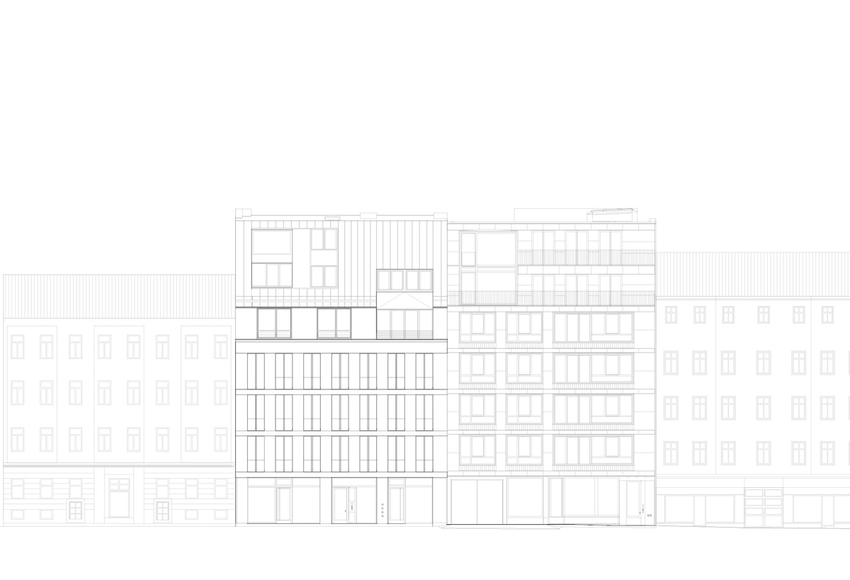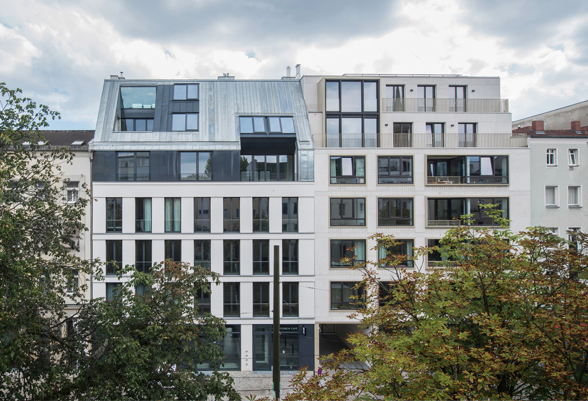 In der Kastanienalle 64 wurde das viergeschossige Bestandshaus aus konstruktiven Gründen abgebrochen. Idee für das neue Gebäude war es, das Bild dieses historischen Berliner Mietshauses in die neue Planung zu integrieren. Die historischen Fensterachsen, der zentral platzierte Hauseingang sowie Anzahl und Höhe der alten Geschosse bleiben daher im Neubau klar erkennbar. Die Dachgeschosse haben wir dagegen eigenständig als skulptural aufgesetzten Hut entworfen.